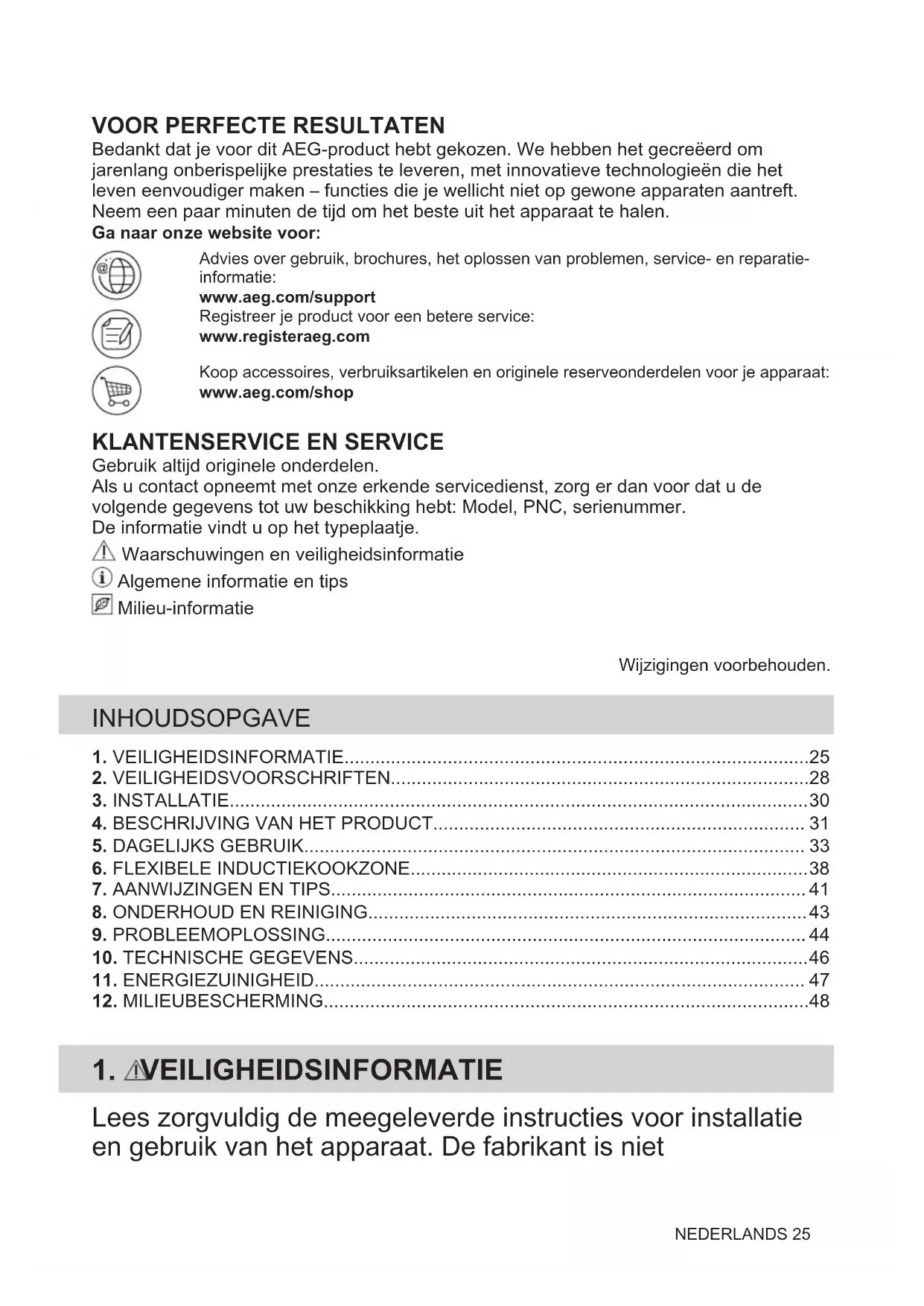 Bedankt dat je voor dit AEG-product hebt gekozen. We hebben het gecreëerd om jarenlang onberispelijke prestaties te leveren, met innovatieve technologieën die het leven eenvoudiger maken – functies die je wellicht niet op gewone apparaten aantreft. Neem een paar minuten de tijd om het beste uit het apparaat te halen. Ga naar onze website voor:Advies over gebruik, brochures, het oplossen van problemen, service- en reparatie-informatie:www.aeg.com/supportRegistreer je product voor een betere service:www.registeraeg.comKoop accessoires, verbruiksartikelen en originele reserveonderdelen voor je apparaat:www.aeg.com/shop