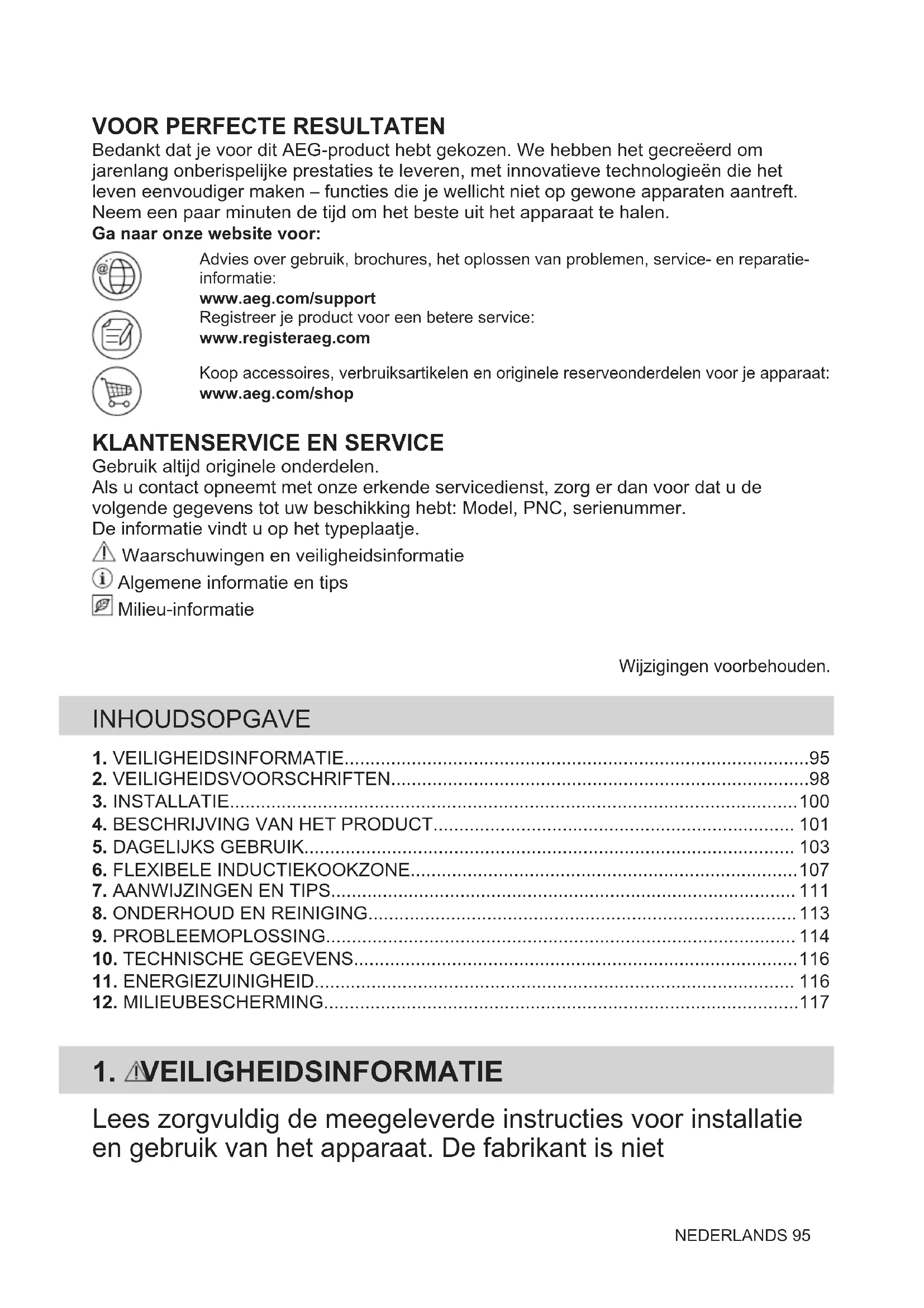 Gebruik altijd originele onderdelen. Als u contact opneemt met onze erkende servicedienst, zorg er dan voor dat u de volgende gegevens tot uw beschikking hebt: Model, PNC, serienummer. De informatie vindt u op het typeplaatje. Waarschuwingen en veiligheidsinformatie Algemene informatie en tips Milieu-informatie Wijzigingen voorbehouden. INHOUDSOPGAVE