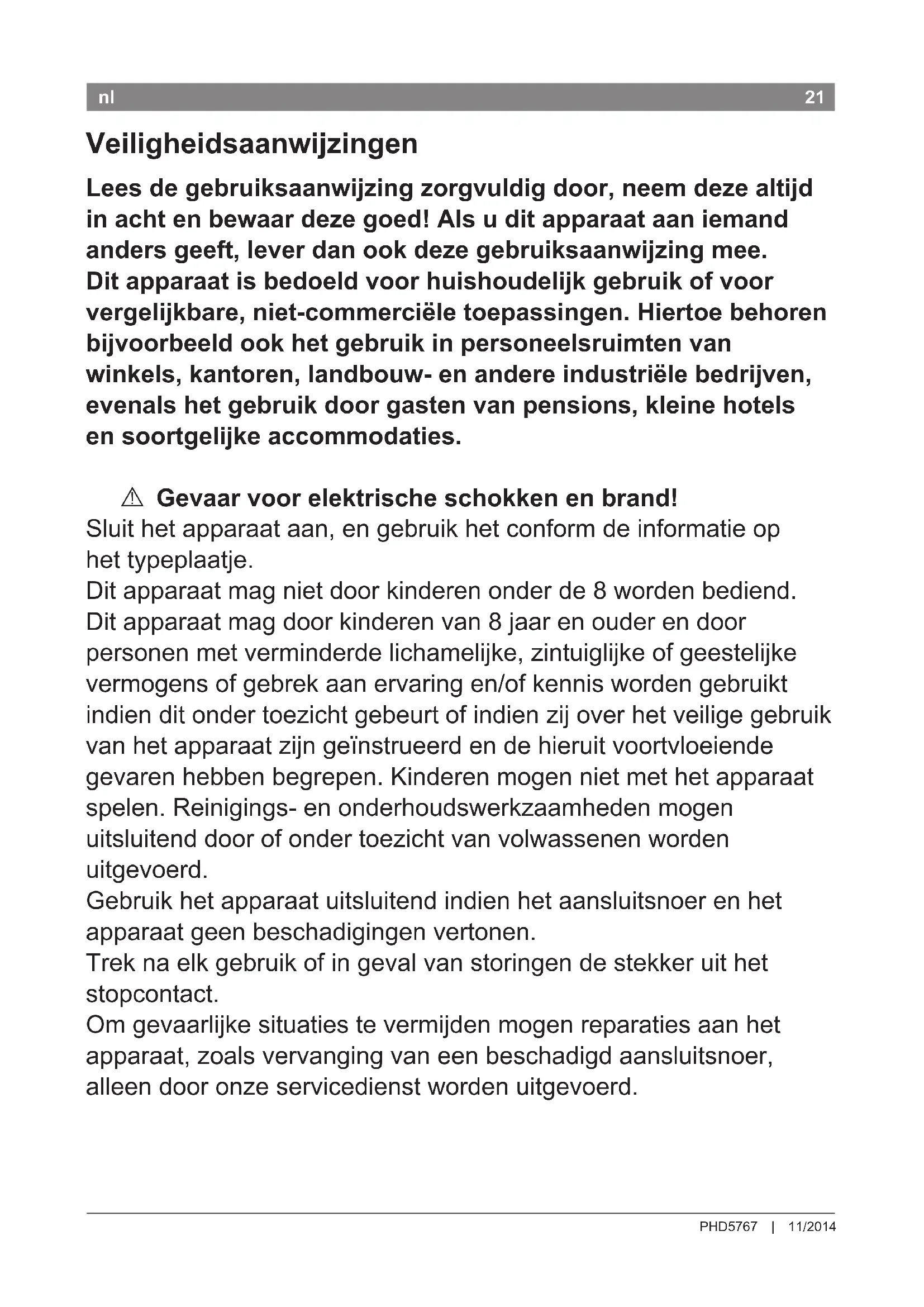 Aansluitsnoer niet ● met hete onderdelen in aanraking laten komen; ● over scherpe randen trekken; ● als draaggreep gebruiken; ● strak oprollen. Vóór het schoonmaken de stekker uit het stopcontact trekken. Stekker niet aan de kabel uittrekken. Het apparaat nooit in water onderdompelen. Gebruik geen stoomreiniger. Niet op kletsnat of kunststof haar gebruiken.