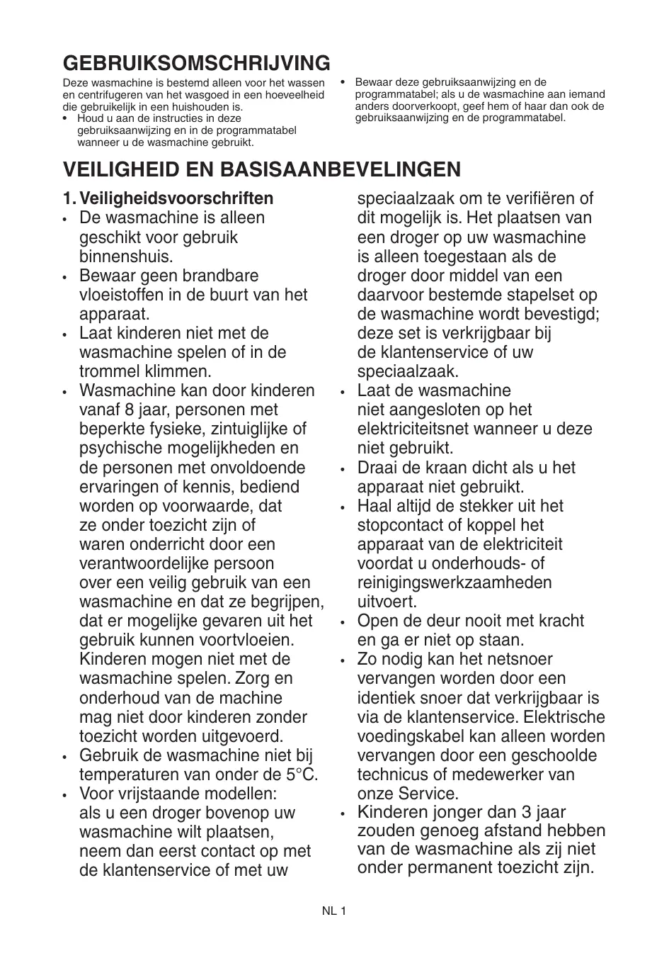 1. Mesures de sécurité • Le lave-linge doit être installé dans une pièce, jamais à l’extérieur. • Ne stockez pas de produits inflammables à proximité du lavelinge. • Pour éviter qu’ils ne jouent avec l’appareil, les enfants ne doivent pas être laissés sans surveillance à proximité du lavelinge. • Le lave-linge peut être utiliser par les enfants de plus de 8 ans, ainsi que les personnes aux capacités physiques, sensorielles ou mentales réduites, ainsi que les personnes pourvues de connaissances insuffisantes sous réserve que ces dernières sont sous surveillance ou instruites par une personnes responsable sur l´utilisation sûre de la machine qu´elles aient compris les dangers potentiels découlant de l´utilisation de cette dernière. Les enfants ne doivent pas jouer avec la machine à laver. La maintenance et l´entretien de la machine à laver ne doivent être faits par les enfants sans surveillance • N’utilisez pas le lave-linge par température inférieure à 5 °C. • Pour les modèles pose-libre: si vous souhaitez installer un