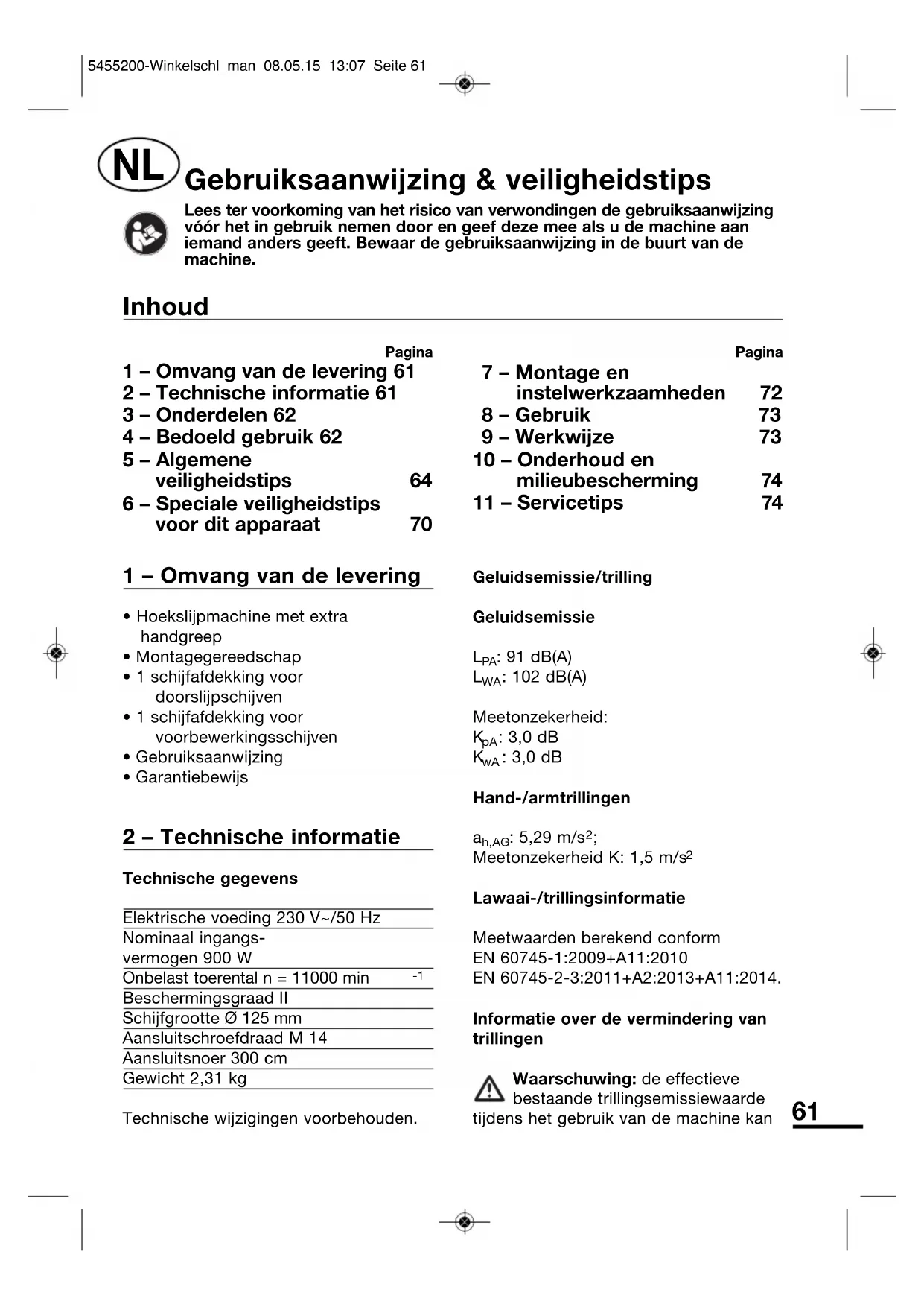 | 1 – Omvang van de levering 61 | 7 – Montage en instelwerkzaamheden | 72 | |