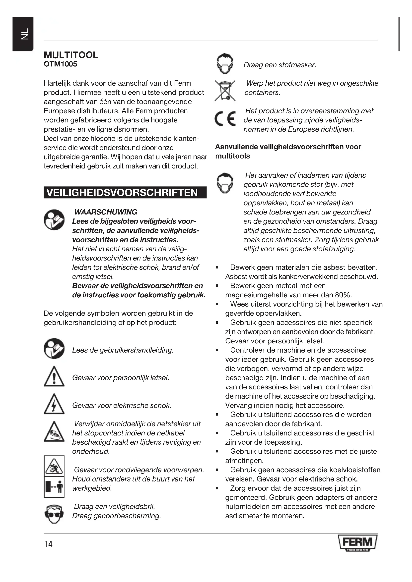 MULTITOOL OTM1005 HartelijkdankvoordeaanschafvanditFerm product.Hiermeeheeftueenuitstekendproduct aangeschaft van één van de toonaangevende Europese distributeurs. Alle Ferm producten worden gefabriceerd volgens de hoogste prestatie-enveiligheidsnormen. Deelvanonzefilosofieisdeuitstekendeklanten- service die wordt ondersteund door onze uitgebreide garantie. Wij hopen dat u vele jaren naar tevredenheid gebruik zult maken van dit product. VEILIGHEIDSVOORSCHRIFTEN WAARSCHUWING Lees de bijgesloten veiligheids voor- schriften, de aanvullende veiligheids- voorschriften en de instructies. Het niet in acht nemen van de veilig- heidsvoorschriften en de instructies kan leiden tot elektrische schok, brand en/of ernstig letsel. Bewaar de veiligheidsvoorschriften en de instructies voor toekomstig gebruik. Devolgendesymbolenwordengebruiktinde gebruikershandleiding of op het product: Lees de gebruikershandleiding. Gevaar voor persoonlijk letsel. Gevaar voor elektrische schok. Verwijder onmiddellijk de netstekker uit het stopcontact indien de netkabel beschadigd raakt en tijdens reiniging en onderhoud. Gevaar voor rondvliegende voorwerpen. Houd omstanders uit de buurt van het werkgebied. Draag een veiligheidsbril. Draag gehoorbescherming. Draag een stofmasker. Werp het product niet weg in ongeschikte containers. Het product is in overeenstemming met de van toepassing zijnde veiligheids- normen in de Europese richtlijnen. Aanvullende veiligheidsvoorschriften voor multitools Het aanraken of inademen van tijdens gebruik vrijkomende stof (bijv. met loodhoudende verf bewerkte oppervlakken, hout en metaal) kan schade toebrengen aan uw gezondheid en de gezondheid van omstanders. Draag altijd geschikte beschermende uitrusting, zoals een stofmasker. Zorg tijdens gebruik altijd voor een goede stofafzuiging.