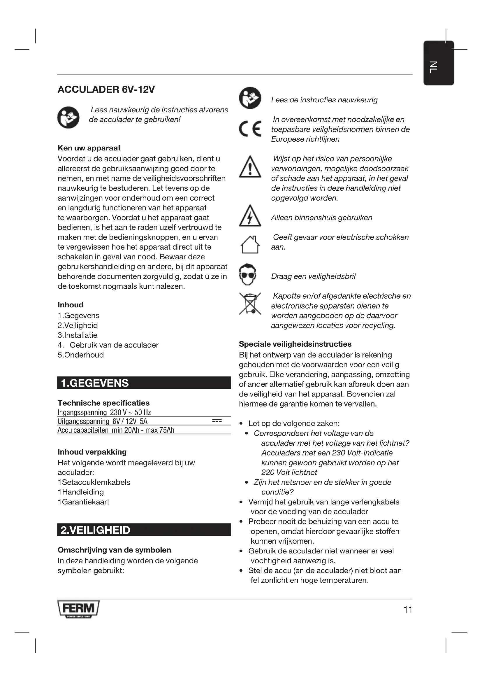 Lees nauwkeurig de instructies alvorens de acculader te gebruiken! Ken uw apparaat Voordat u de acculader gaat gebruiken, dient u allereerst de gebruiksaanwijzing goed door te nemen, en met name de veiligheidsvoorschriften nauwkeurig te bestuderen. Let tevens op de aanwijzingen voor onderhoud om een correct en langdurig functioneren van het apparaat te waarborgen. Voordat u het apparaat gaat bedienen, is het aan te raden uzelf vertrouwd te maken met de bedieningsknoppen, en u ervan te vergewissen hoe het apparaat direct uit te schakelen in geval van nood. Bewaar deze gebruikershandleiding en andere, bij dit apparaat behorende documenten zorgvuldig, zodat u ze in de toekomst nogmaals kunt nalezen. Inhoud