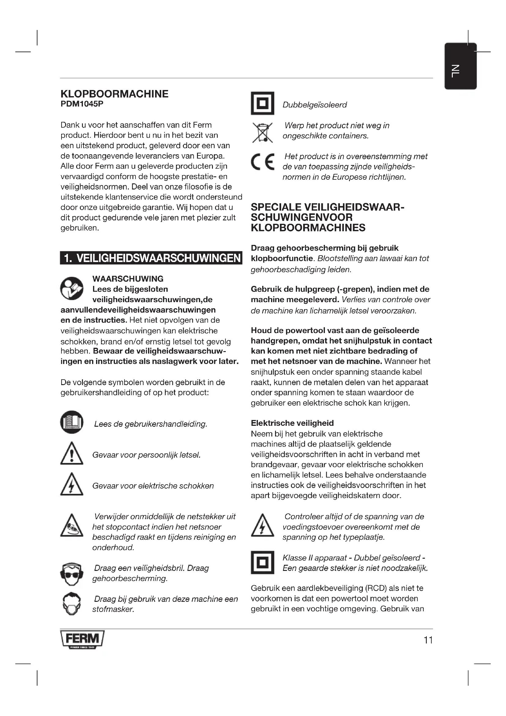KLOPBOORMACHINE PDM1045P Dank u voor het aanschaffen van dit Ferm product. Hierdoor bent u nu in het bezit van een uitstekend product, geleverd door een van de toonaangevende leveranciers van Europa. Alle door Ferm aan u geleverde producten zijn vervaardigd conform de hoogste prestatie- en veiligheidsnormen. Deel van onze filosofie is de uitstekende klantenservice die wordt ondersteund door onze uitgebreide garantie. Wij hopen dat u dit product gedurende vele jaren met plezier zult gebruiken.
