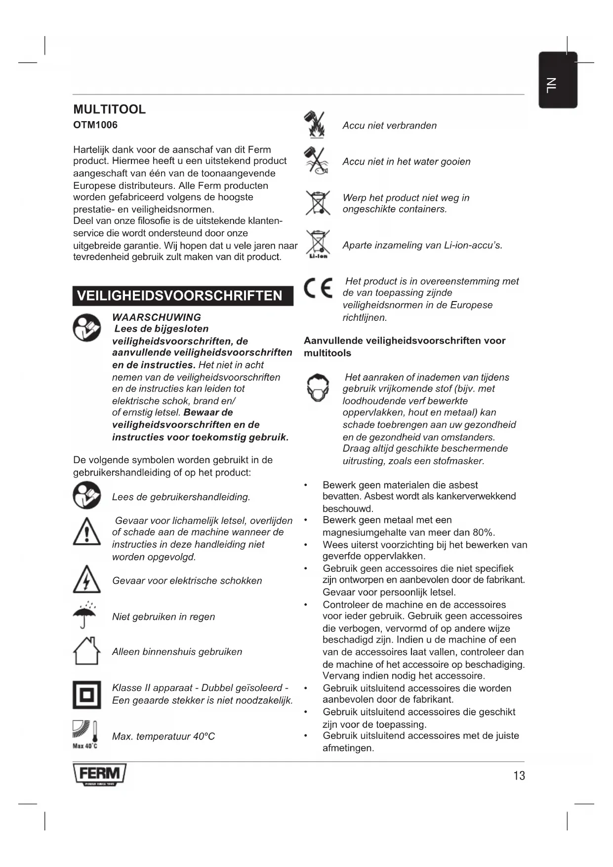 DEMULTITOOL OTM1006 HartelijkdankvoordeaanschafvanditFerm product.Hiermeeheeftueenuitstekendproduct aangeschaftvanéénvandetoonaangevende Europesedistributeurs.AlleFermproducten wordengefabriceerdvolgensdehoogste prestatie-enveiligheidsnormen. Deelvanonzefilosofieisdeuitstekendeklanten- servicediewordtondersteunddooronze uitgebreidegarantie.Wijhopendatuvelejarennaar tevredenheidgebruikzultmakenvanditproduct. VEILIGHEIDSVOORSCHRIFTEN WAARSCHUWING Lees de bijgesloten veiligheidsvoorschriften, de aanvullende veiligheidsvoorschriften en de instructies. Het niet in acht nemen van de veiligheidsvoorschriften en de instructies kan leiden tot elektrische schok, brand en/ of ernstig letsel. Bewaar de veiligheidsvoorschriften en de instructies voor toekomstig gebruik. Devolgendesymbolenwordengebruiktinde gebruikershandleidingofophetproduct: Lees de gebruikershandleiding. Gevaar voor lichamelijk letsel, overlijden of schade aan de machine wanneer de instructies in deze handleiding niet worden opgevolgd. Gevaar voor elektrische schokken Niet gebruiken in regen Alleen binnenshuis gebruiken Klasse II apparaat - Dubbel geïsoleerd - Een geaarde stekker is niet noodzakelijk. Max. temperatuur 40°C Accu niet verbranden Accu niet in het water gooien Werp het product niet weg in ongeschikte containers. Aparte inzameling van Li-ion-accu’s. Het product is in overeenstemming met de van toepassing zijnde veiligheidsnormen in de Europese richtlijnen. Aanvullende veiligheidsvoorschriften voor multitools Het aanraken of inademen van tijdens gebruik vrijkomende stof (bijv. met loodhoudende verf bewerkte oppervlakken, hout en metaal) kan schade toebrengen aan uw gezondheid en de gezondheid van omstanders. Draag altijd geschikte beschermende uitrusting, zoals een stofmasker.