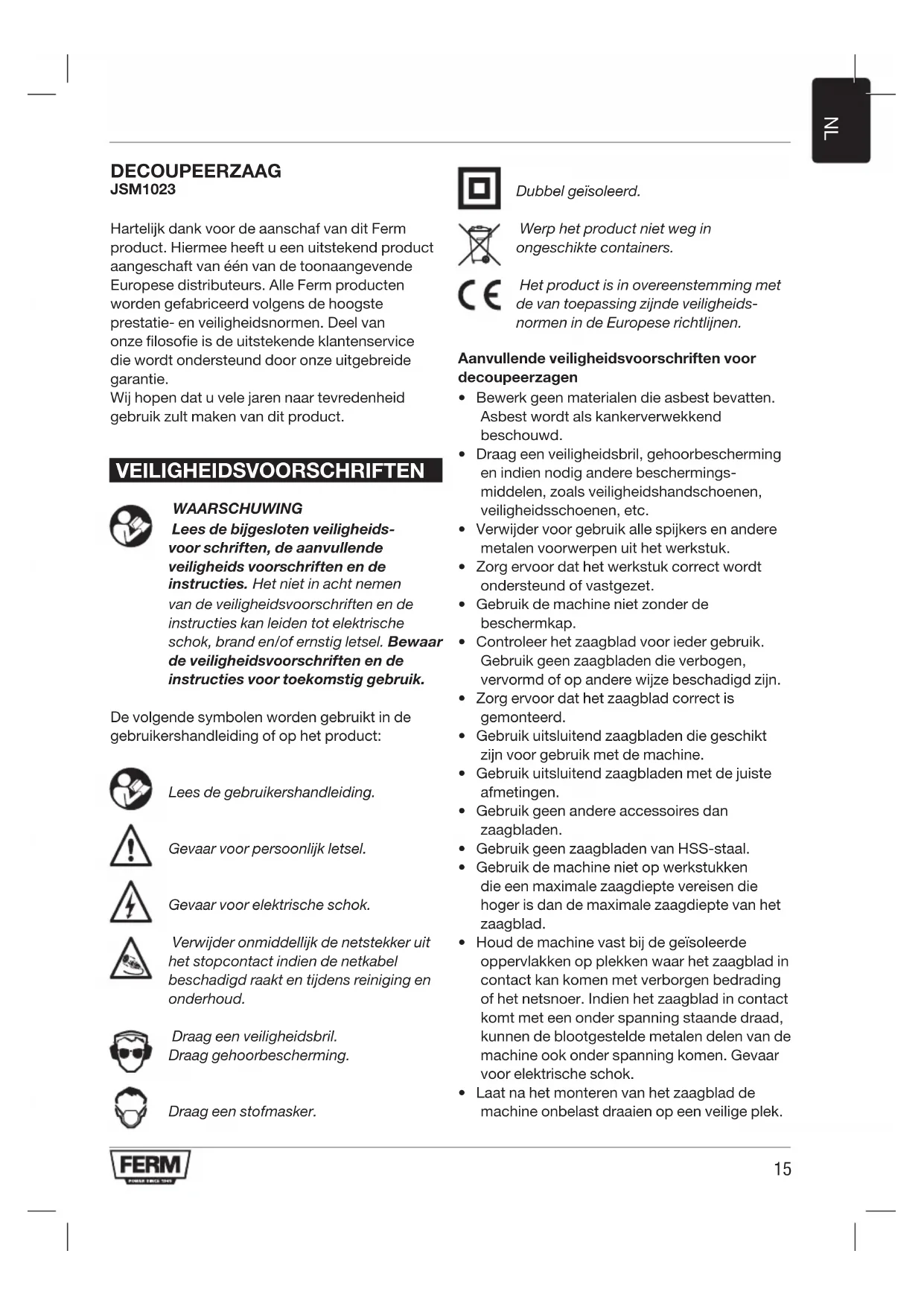 DECOUPEERZAAG JSM1023 Hartelijk dank voor de aanschaf van dit Ferm product. Hiermee heeft u een uitstekend product aangeschaft van één van de toonaangevende Europese distributeurs. Alle Ferm producten worden gefabriceerd volgens de hoogste prestatie- en veiligheidsnormen. Deel van onze filosofie is de uitstekende klantenservice die wordt ondersteund door onze uitgebreide garantie. Wij hopen dat u vele jaren naar tevredenheid gebruik zult maken van dit product. VEILIGHEIDSVOORSCHRIFTEN WAARSCHUWING Lees de bijgesloten veiligheids- voor schriften, de aanvullende veiligheids voorschriften en de instructies. Het niet in acht nemen van de veiligheidsvoorschriften en de instructies kan leiden tot elektrische schok, brand en/of ernstig letsel. Bewaar de veiligheidsvoorschriften en de instructies voor toekomstig gebruik. De volgende symbolen worden gebruikt in de gebruikershandleiding of op het product: Lees de gebruikershandleiding. Gevaar voor persoonlijk letsel. Gevaar voor elektrische schok. Verwijder onmiddellijk de netstekker uit het stopcontact indien de netkabel beschadigd raakt en tijdens reiniging en onderhoud. Draag een veiligheidsbril. Draag gehoorbescherming. Draag een stofmasker. Dubbel geïsoleerd. Werp het product niet weg in ongeschikte containers. Het product is in overeenstemming met de van toepassing zijnde veiligheids- normen in de Europese richtlijnen. Aanvullende veiligheidsvoorschriften voor decoupeerzagen