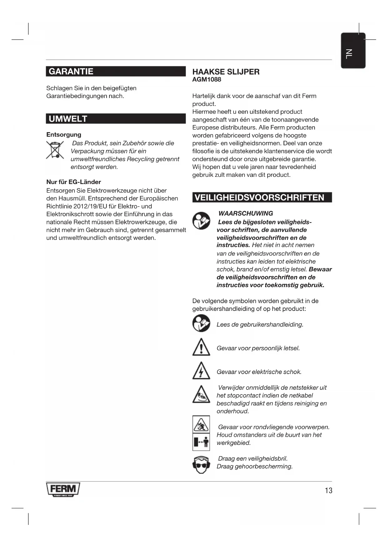 GARANTIE Schlagen Sie in den beigefügten Garantiebedingungen nach. UMWELT Entsorgung Das Produkt, sein Zubehör sowie die Verpackung müssen für ein umweltfreundliches Recycling getrennt entsorgt werden. Nur für EG-Länder Entsorgen Sie Elektrowerkzeuge nicht über den Hausmüll. Entsprechend der Europäischen Richtlinie 2012/19/EU für Elektro- und Elektronikschrott sowie der Einführung in das nationale Recht müssen Elektrowerkzeuge, die nicht mehr im Gebrauch sind, getrennt gesammelt und umweltfreundlich entsorgt werden. HAAKSE SLIJPER AGM1088 Hartelijk dank voor de aanschaf van dit Ferm product. Hiermee heeft u een uitstekend product aangeschaft van één van de toonaangevende Europese distributeurs. Alle Ferm producten worden gefabriceerd volgens de hoogste prestatie- en veiligheidsnormen. Deel van onze filosofie is de uitstekende klantenservice die wordt ondersteund door onze uitgebreide garantie. Wij hopen dat u vele jaren naar tevredenheid gebruik zult maken van dit product. VEILIGHEIDSVOORSCHRIFTEN WAARSCHUWING Lees de bijgesloten veiligheids- voor schriften, de aanvullende veiligheidsvoorschriften en de instructies. Het niet in acht nemen van de veiligheidsvoorschriften en de instructies kan leiden tot elektrische schok, brand en/of ernstig letsel. Bewaar de veiligheidsvoorschriften en de instructies voor toekomstig gebruik. De volgende symbolen worden gebruikt in de gebruikershandleiding of op het product: Lees de gebruikershandleiding. Gevaar voor persoonlijk letsel. Gevaar voor elektrische schok. Verwijder onmiddellijk de netstekker uit het stopcontact indien de netkabel beschadigd raakt en tijdens reiniging en onderhoud. Gevaar voor rondvliegende voorwerpen. Houd omstanders uit de buurt van het werkgebied. Draag een veiligheidsbril. Draag gehoorbescherming.14