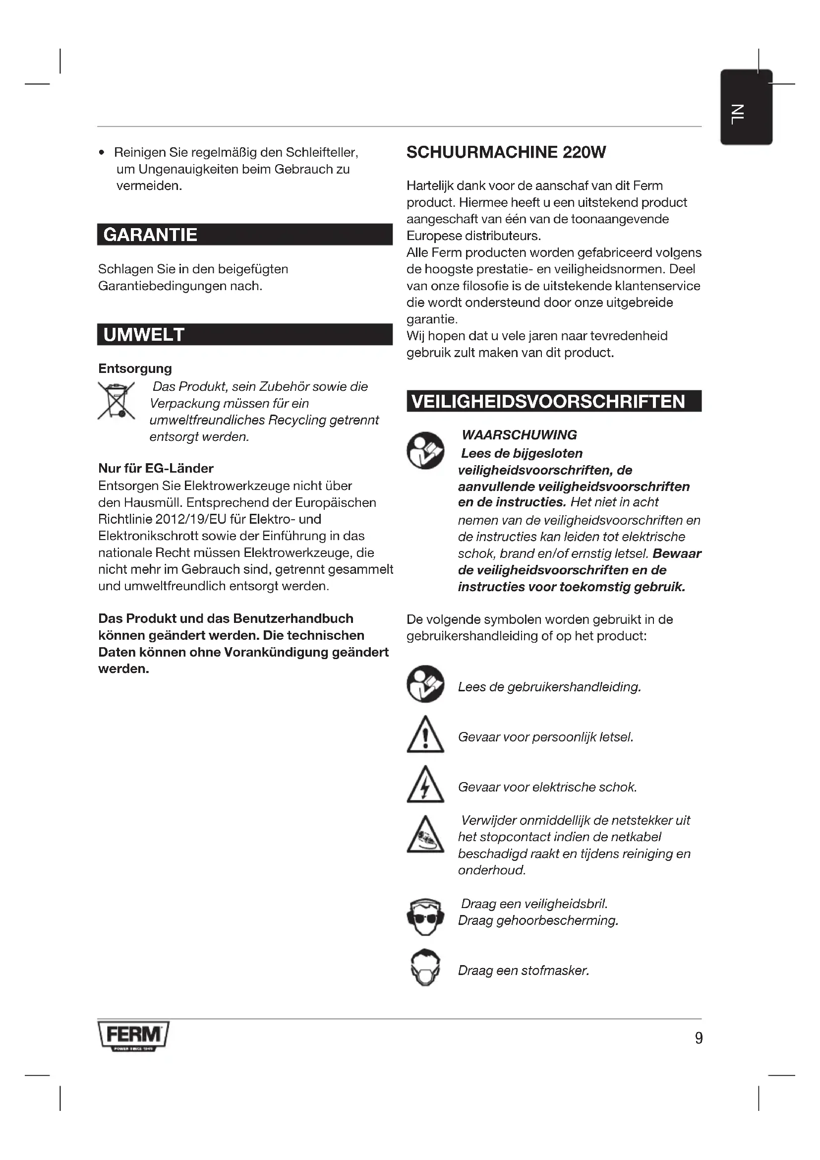 - Reinigen Sie regelmäßig den Schleifteller, um Ungenauigkeiten beim Gebrauch zu vermeiden. GARANTIE Schlagen Sie in den beigefügten Garantiebedingungen nach. UMWELT Entsorgung Das Produkt, sein Zubehör sowie die Verpackung müssen für ein umweltfreundliches Recycling getrennt entsorgt werden. Nur für EG-Länder Entsorgen Sie Elektrowerkzeuge nicht über den Hausmüll. Entsprechend der Europäischen Richtlinie 2012/19/EU für Elektro- und Elektronikschrott sowie der Einführung in das nationale Recht müssen Elektrowerkzeuge, die nicht mehr im Gebrauch sind, getrennt gesammelt und umweltfreundlich entsorgt werden. Das Produkt und das Benutzerhandbuch können geändert werden. Die technischen Daten können ohne Vorankündigung geändert werden. SCHUURMACHINE 220W Hartelijk dank voor de aanschaf van dit Ferm product. Hiermee heeft u een uitstekend product aangeschaft van één van de toonaangevende Europese distributeurs. Alle Ferm producten worden gefabriceerd volgens de hoogste prestatie- en veiligheidsnormen. Deel van onze filosofie is de uitstekende klantenservice die wordt ondersteund door onze uitgebreide garantie. Wij hopen dat u vele jaren naar tevredenheid gebruik zult maken van dit product. VEILIGHEIDSVOORSCHRIFTEN WAARSCHUWING Lees de bijgesloten veiligheidsvoorschriften, de aanvullende veiligheidsvoorschriften en de instructies. Het niet in acht nemen van de veiligheidsvoorschriften en de instructies kan leiden tot elektrische schok, brand en/of ernstig letsel. Bewaar de veiligheidsvoorschriften en de instructies voor toekomstig gebruik. De volgende symbolen worden gebruikt in de gebruikershandleiding of op het product: Lees de gebruikershandleiding. Gevaar voor persoonlijk letsel. Gevaar voor elektrische schok. Verwijder onmiddellijk de netstekker uit het stopcontact indien de netkabel beschadigd raakt en tijdens reiniging en onderhoud. Draag een veiligheidsbril. Draag gehoorbescherming. Draag een stofmasker.10