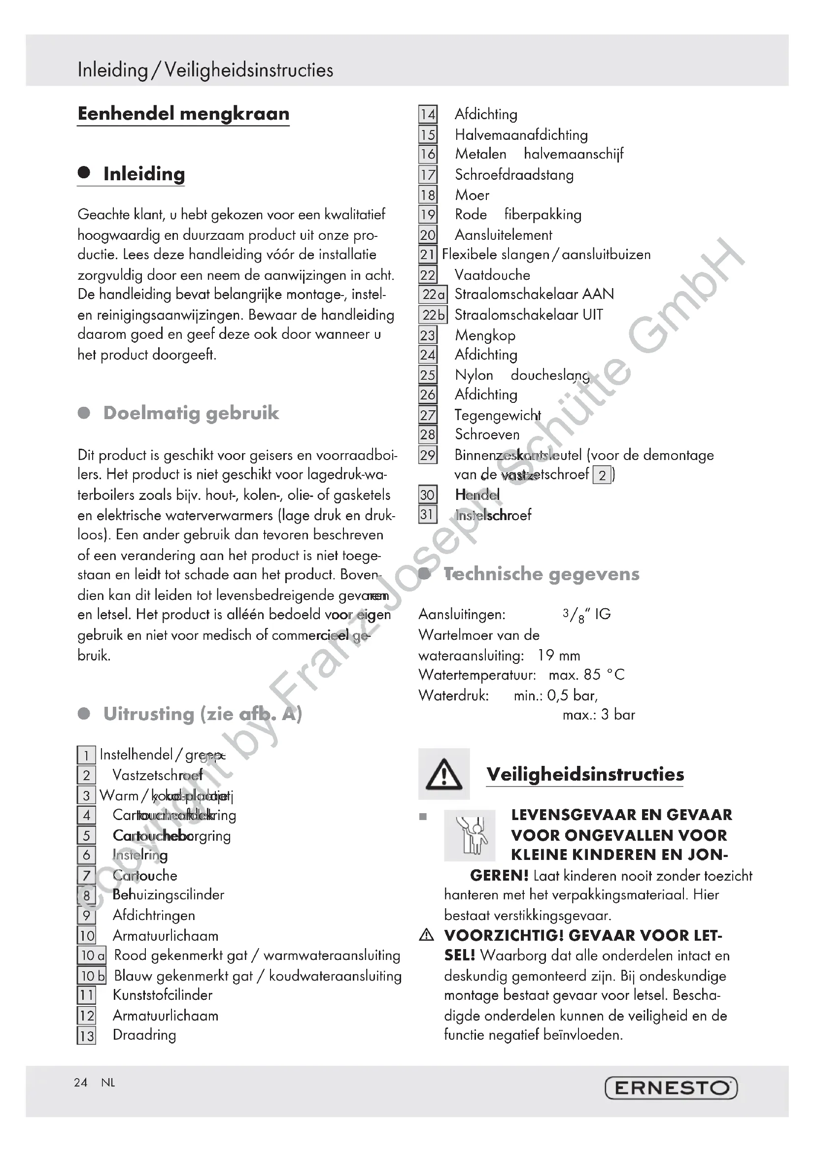 Inleiding Geachte klant, u hebt gekozen voor een kwalitatief hoogwaardig en duurzaam product uit onze pro- ductie. Lees deze handleiding vóór de installatie zorgvuldig door een neem de aanwijzingen in acht. De handleiding bevat belangrijke montage-, instel- en reinigingsaanwijzingen. Bewaar de handleiding daarom goed en geef deze ook door wanneer u het product doorgeeft. Doelmatig gebruik Dit product is geschikt voor geisers en voorraadboi- lers. Het product is niet geschikt voor lagedruk-wa- terboilers zoals bijv. hout-, kolen-, olie- of gasketels en elektrische waterverwarmers (lage druk en druk- loos). Een ander gebruik dan tevoren beschreven of een verandering aan het product is niet toege- staan en leidt tot schade aan het product. Boven- dien kan dit leiden tot levensbedreigende gevaren en letsel. Het product is alléén bedoeld voor eigen gebruik en niet voor medisch of commercieel ge- bruik. Uitrusting (zie afb. A)