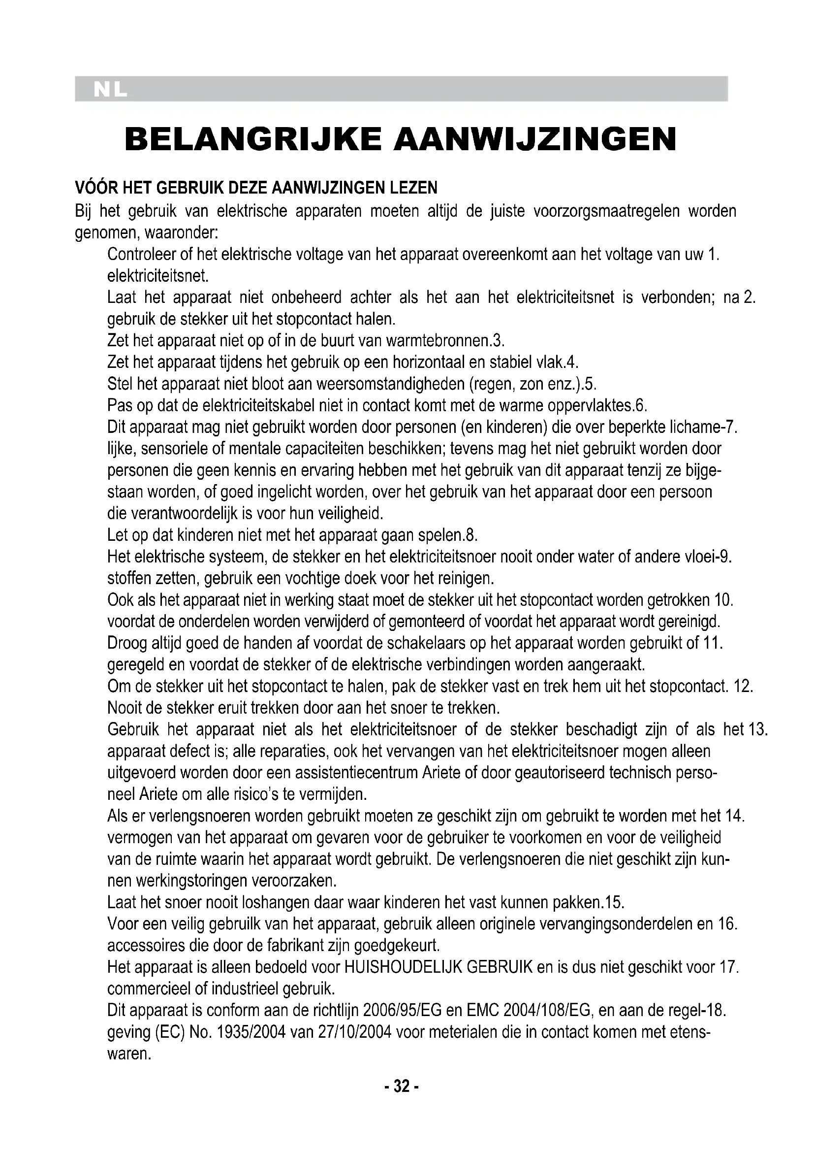 Gebruik het apparaat niet als het elektriciteitsnoer of de stekker beschadigt zijn of als het 13. apparaat defect is; alle reparaties, ook het vervangen van het elektriciteitsnoer mogen alleen uitgevoerd worden door een assistentiecentrum Ariete of door geautoriseerd technisch personeel Ariete om alle risico's te vermijden.