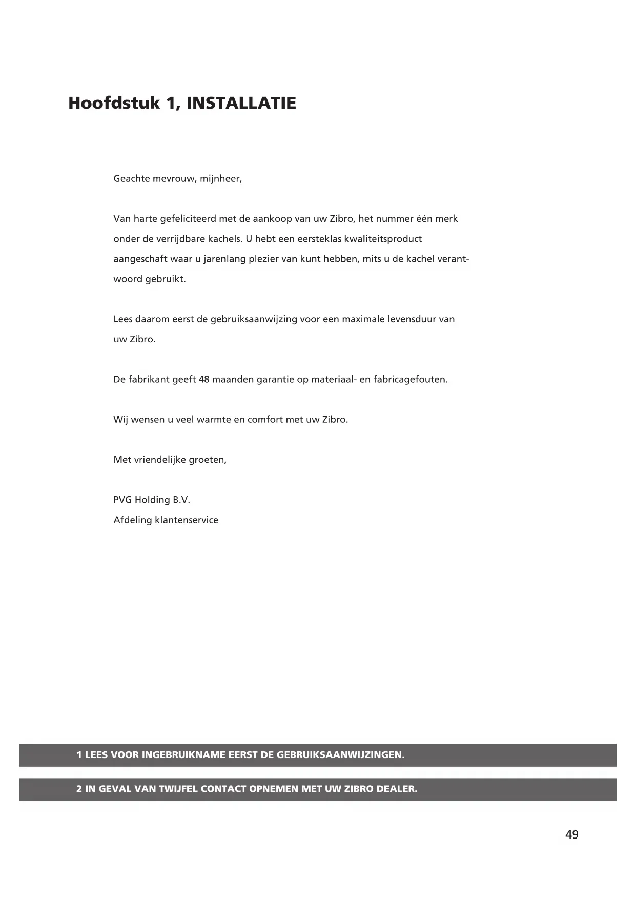 7Geachte mevrouw, mijnheer, Van harte gefeliciteerd met de aankoop van uw Zibro, het nummer één merk onder de verrijdbare kachels. U hebt een eersteklas kwaliteitsproduct aangeschaft waar u jarenlang plezier van kunt hebben, mits u de kachel verant- woord gebruikt. Lees daarom eerst de gebruiksaanwijzing voor een maximale levensduur van uw Zibro. De fabrikant geeft 48 maanden garantie op materiaal- en fabricagefouten. Wij wensen u veel warmte en comfort met uw Zibro. Met vriendelijke groeten, PVG Holding B.V. Afdeling klantenservice 1 LEES VOOR INGEBRUIKNAME EERST DE GEBRUIKSAANWIJZINGEN. 2 IN GEVAL VAN TWIJFEL CONTACT OPNEMEN MET UW ZIBRO DEALER.