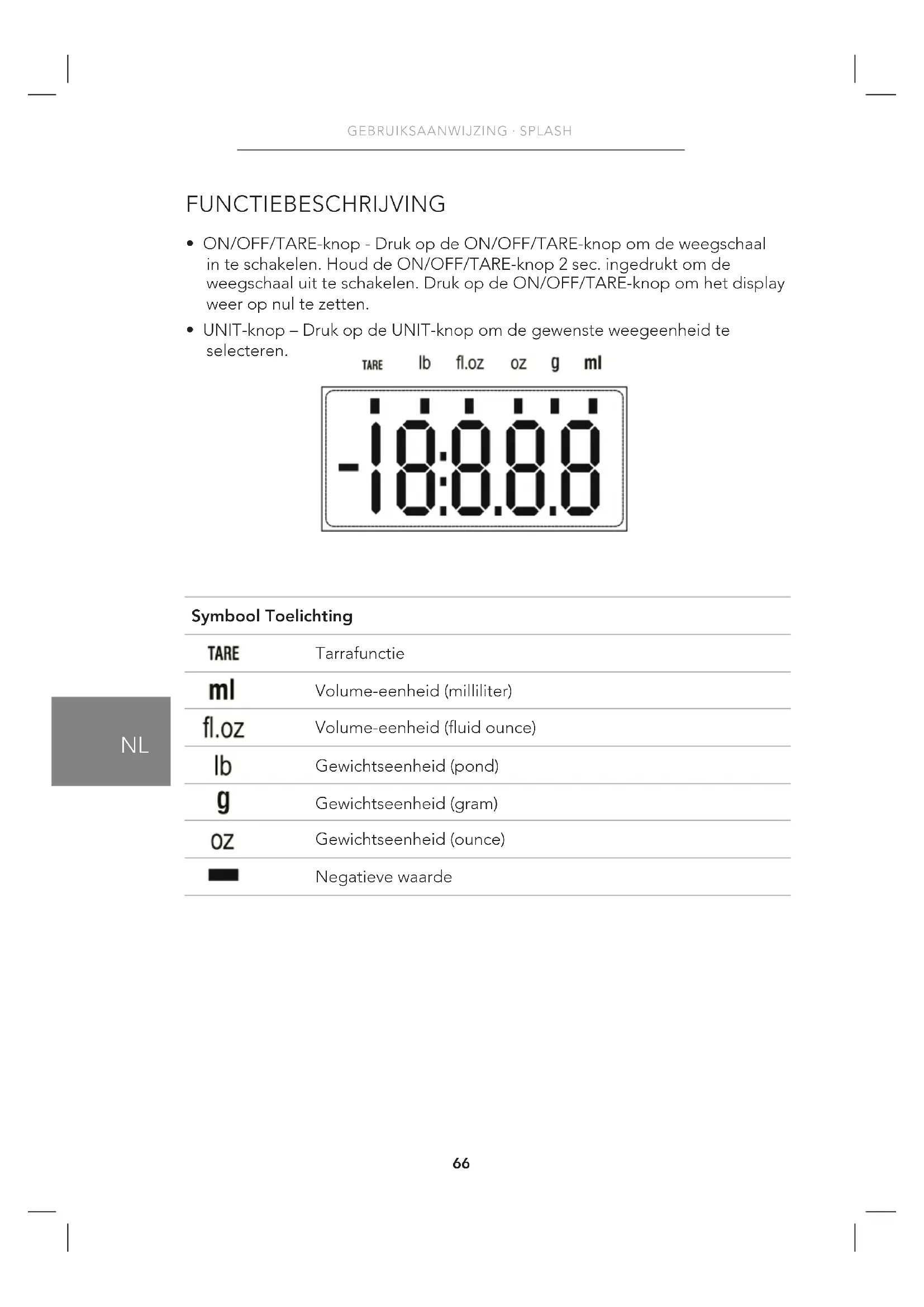 - UNIT-knop – Druk op de UNIT-knop om de gewenste weegeenheid te selecteren. Symbool Toelichting Tarrafunctie Volume-eenheid (milliliter) Volume-eenheid (uid ounce) Gewichtseenheid (pond) Gewichtseenheid (gram) Gewichtseenheid (ounce) Negatieve waarde67