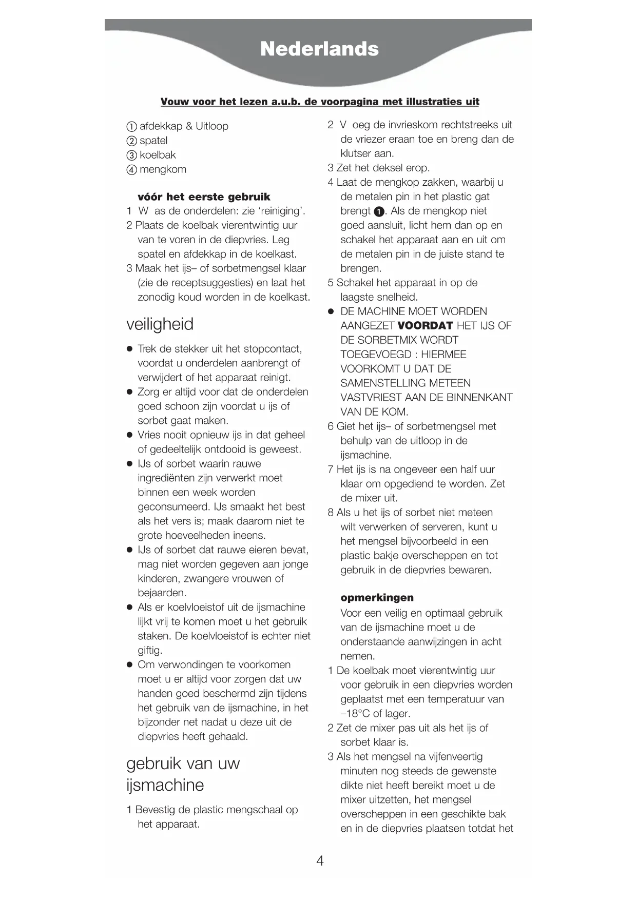 VAN DE KOM. 6 Giet het ijs– of sorbetmengsel met behulp van de uitloop in de ijsmachine. 7 Het ijs is na ongeveer een half uur klaar om opgediend te worden. Zet de mixer uit. 8 Als u het ijs of sorbet niet meteen wilt verwerken of serveren, kunt u het mengsel bijvoorbeeld in een plastic bakje overscheppen en tot gebruik in de diepvries bewaren. opmerkingen Voor een veilig en optimaal gebruik van de ijsmachine moet u de onderstaande aanwijzingen in acht nemen. 1 De koelbak moet vierentwintig uur voor gebruik in een diepvries worden geplaatst met een temperatuur van –18°C of lager. 2 Zet de mixer pas uit als het ijs of sorbet klaar is. 3 Als het mengsel na vijfenveertig minuten nog steeds de gewenste dikte niet heeft bereikt moet u de mixer uitzetten, het mengsel overscheppen in een geschikte bak en in de diepvries plaatsen totdat het