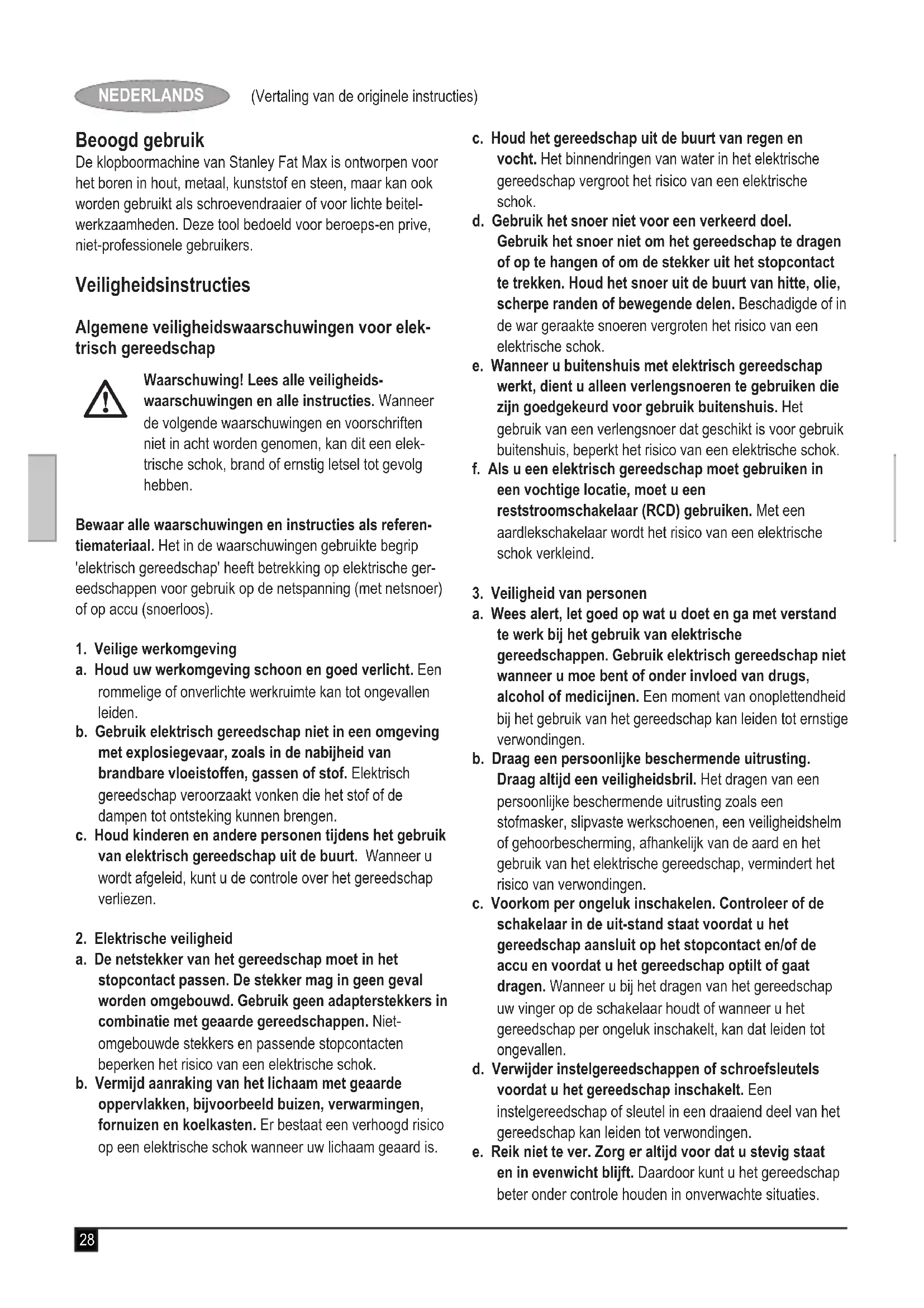 d. Bewaar nicht-gebruike elektrische gereedschappen buiten bereik van kinderen. Laat het gereedschap nicht gebruiken door Personen die er nicht vertrouwd mee zich en deze aanwijzingen Niet hebben gelezen. Elektrische gereedschappen zich gevaarlijk wanner deze worden gebruikt door onervaren Personen.
