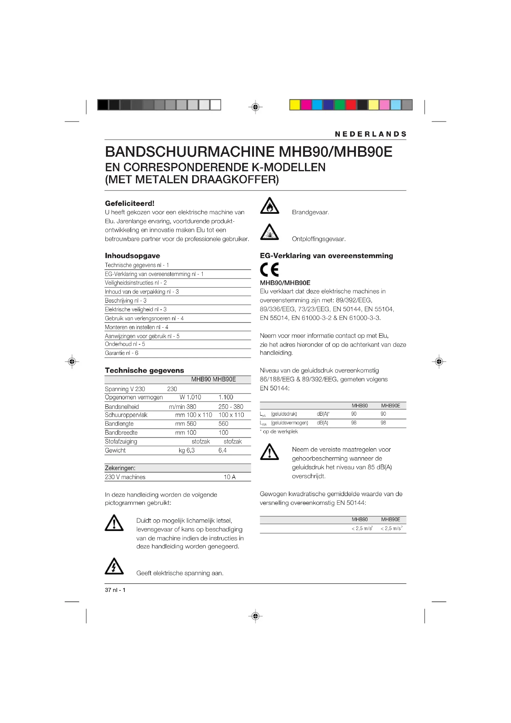 (geluidsvermogen) dB(A) 98 98* op de werkplek Neem de vereiste maatregelen voor gehoorbescherming wanneer de geluidsdruk het niveau van 85 dB(A) overschrijdt. Gewogen kwadratische gemiddelde waarde van de versnelling overeenkomstig EN 50144: MHB90 MHB90E< 2,5 m/s < 2,5 m/s 2NEDERLANDS nl - 2 38 Director Engineering and Product Development Horst Großmann Elu International, Richard-Klinger-Straße 40, D-65510, Idstein, Duitsland Veiligheidsinstructies Neem bij het gebruik van elektrische machines altijd de plaatselijk geldende veiligheidsvoor- schriften in acht in verband met brandgevaar, gevaar voor elektrische schokken en lichamelijk letsel. Lees ook onderstaande instructies aandachtig door voordat u met de machine gaat werken. Bewaar deze instructies zorgvuldig! Algemeen 1 Zorg voor een opgeruimde werkomgeving Een rommelige werkomgeving leidt tot ongelukken. 2 Houd rekening met omgevingsinvloeden Stel elektrische machines niet bloot aan vocht. Zorg dat de werkomgeving goed is verlicht. Gebruik elektrische machines niet in de buurt van brandbare vloeistoffen of gassen. 3 Voorkom een elektrische schok Vermijd lichamelijk contact met geaarde voorwerpen (bijv. buizen, radiatoren, fornuizen en koelkasten). Onder extreme werkomstandigheden (bijv. hoge vochtigheid, ontwikkeling van metaalstof, enz.) kan de elektrische veiligheid door een scheidingstransformator of een aardlek-(FI-) schakelaar voor te schakelen, verhoogd worden. 4 Houd kinderen uit de buurt Laat andere personen niet aan de machine of het verlengsnoer komen. Onder 16 jaar is supervisie verplicht. 5 Verlengsnoeren voor gebruik buitenshuis Gebruik buitenshuis uitsluitend voor dit doel goed- gekeurde en als zodanig gemerkte verlengsnoeren. 6 Berg de machine veilig op Berg niet in gebruik zijnde elektrische machines op in een droge, afgesloten ruimte, buiten het bereik van kinderen. 7 Draag geschikte werkkleding Draag geen wijde kleding of loshangende sieraden. Deze kunnen door de bewegende delen worden gegrepen. Draag bij het werken buitenshuis bij voorkeur rubberen werkhandschoenen en schoenen met profielzolen. Houd lang haar bijeen. 8 Draag een veiligheidsbril Gebruik ook een gezichts- of stofmasker bij werkzaamheden waarbij stofdeeltjes of spanen vrijkomen. 9 Let op de maximum geluidsdruk Neem voorzorgsmaatregelen voor gehoorbescherming wanneer de geluidsdruk het niveau van 85 dB(A) overschrijdt. 10 Klem het werkstuk goed vast Gebruik klemmen of een bankschroef om het werkstuk te fixeren. Dit is veiliger, bovendien kan de machine dan met beide handen worden bediend. 11 Zorg voor een veilige houding Zorg altijd voor een juiste, stabiele houding. 12 Voorkom onbedoeld inschakelen Draag een op het net aangesloten machine niet met de vinger aan de schakelaar. Laat de schakelaar los wanneer u de stekker in het stopcontact steekt. 13 Blijf voortdurend opletten Houd uw aandacht bij uw werk. Ga met verstand te werk. Gebruik de machine niet als u niet geconcentreerd bent. 14 Trek de stekker uit het stopcontact Schakel de stroom uit en wacht totdat de machine volledig stil staat voordat u deze achterlaat. Trek de stekker uit het stopcontact wanneer u de machine niet gebruikt, tijdens onderhoud of bij het vervangen van accessoires. 15 Verwijder sleutels of hulpgereedschappen Controleer vóór het inschakelen altijd of sleutels en andere hulpgereedschappen zijn verwijderd. 16 Gebruik de juiste machine Het gebruik volgens bestemming is beschreven in deze handleiding. Gebruik geen lichte machine of hulpstukken voor het werk van zware machines. De machine werkt beter en veiliger indien u deze gebruikt voor het beoogde doel. Waarschuwing! Gebruik ter voorkoming van lichamelijk letsel uitsluitend de in deze gebruiksaanwijzing aanbevolen accessoires en hulpstukken. Gebruik de machine uitsluitend voor het beoogde doel. 17 Gebruik het snoer niet verkeerd Draag de machine nooit aan het snoer. Trek niet aan het snoer om de stekker uit het stopcontact te verwijderen. Houd het snoer uit de buurt van39 nl - 3 NEDERLANDS Inhoud van de verpakking De verpakking bevat: 1 Bandschuurmachine 1 Stofzak 1 Stofafzuigadapter (optie) 1 Schuurbanden 1 Schuurframe (alleen voor K-modellen) 1 Handleiding 1 Onderdelentekening