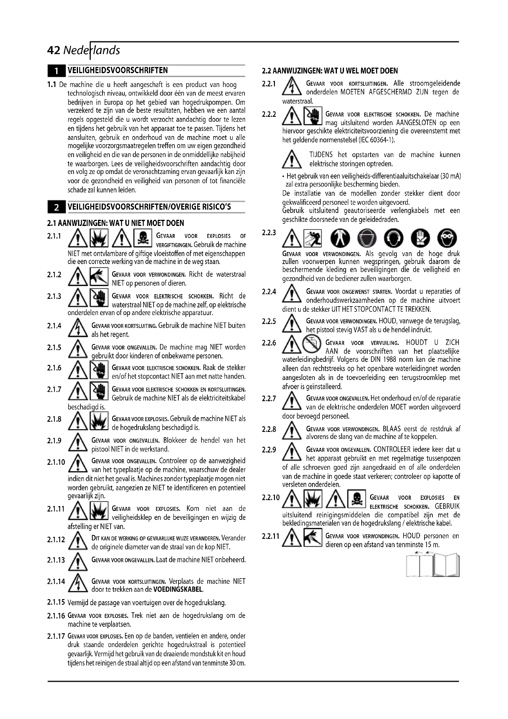 technologisch niveau, ontwikkeld door één van de meest ervaren bedrijven in Europa op het gebied van hogedrukpompen. Om verzekerd te zijn van de beste resultaten, hebben we een aantal regels opgesteld die u wordt verzocht aandachtig door te lezen en tijdens het gebruik van het apparaat toe te passen. Tijdens het aansluiten, gebruik en onderhoud van de machine moet u alle mogelijke voorzorgsmaatregelen treffen om uw eigen gezondheid en veiligheid en die van de personen in de onmiddellijke nabijheid te waarborgen. Lees de veiligheidsvoorschriften aandachtig door en volg ze op omdat de veronachtzaming ervan gevaarlijk kan zijn voor de gezondheid en veiligheid van personen of tot financiële schade zal kunnen leiden.