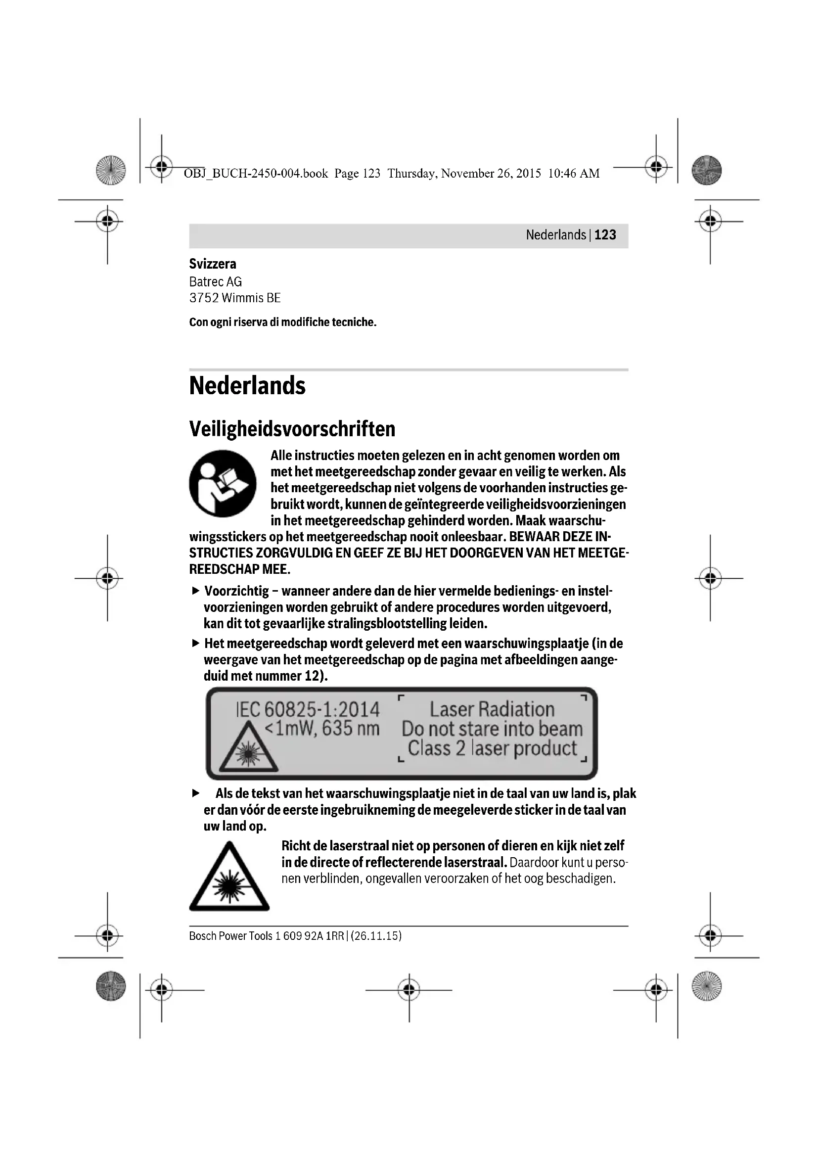 OBJ_BUCH-2450-004.book Page 125 Thursday, November 26, 2015 10:46 AM126 | Nederlands 1 609 92A 1RR | (26.11.15) Bosch Power Tools Conformiteitsverklaring We verklaren op onze verantwoordelijkheid dat het onder „Technische gegevens” beschreven product aan alle desbetreffende bepalingen van de richtlijnen 1999/5/EG en 2011/65/EU inclusief van de wijzigingen ervan voldoet en met de volgende normen overeenstemt: EN 61010-1: 2010-10, EN 60825-1: 2014-08, EN 300 328 V1.8.1: 2012-06, EN 301 489-1 V1.8.1: 2008-04, EN 301 489-1 V1.9.2: 2011-09, EN 301 489-17 V2.2.1: 2012-09, EN 62479: 2010-09, EN 50581: 2012. Batterijen 2x1,5VLR03(AAA) Accucellen 2 x 1,2 V HR03 (AAA) Levensduur batterij ca. –afzonderlijke metingen – duurmeting