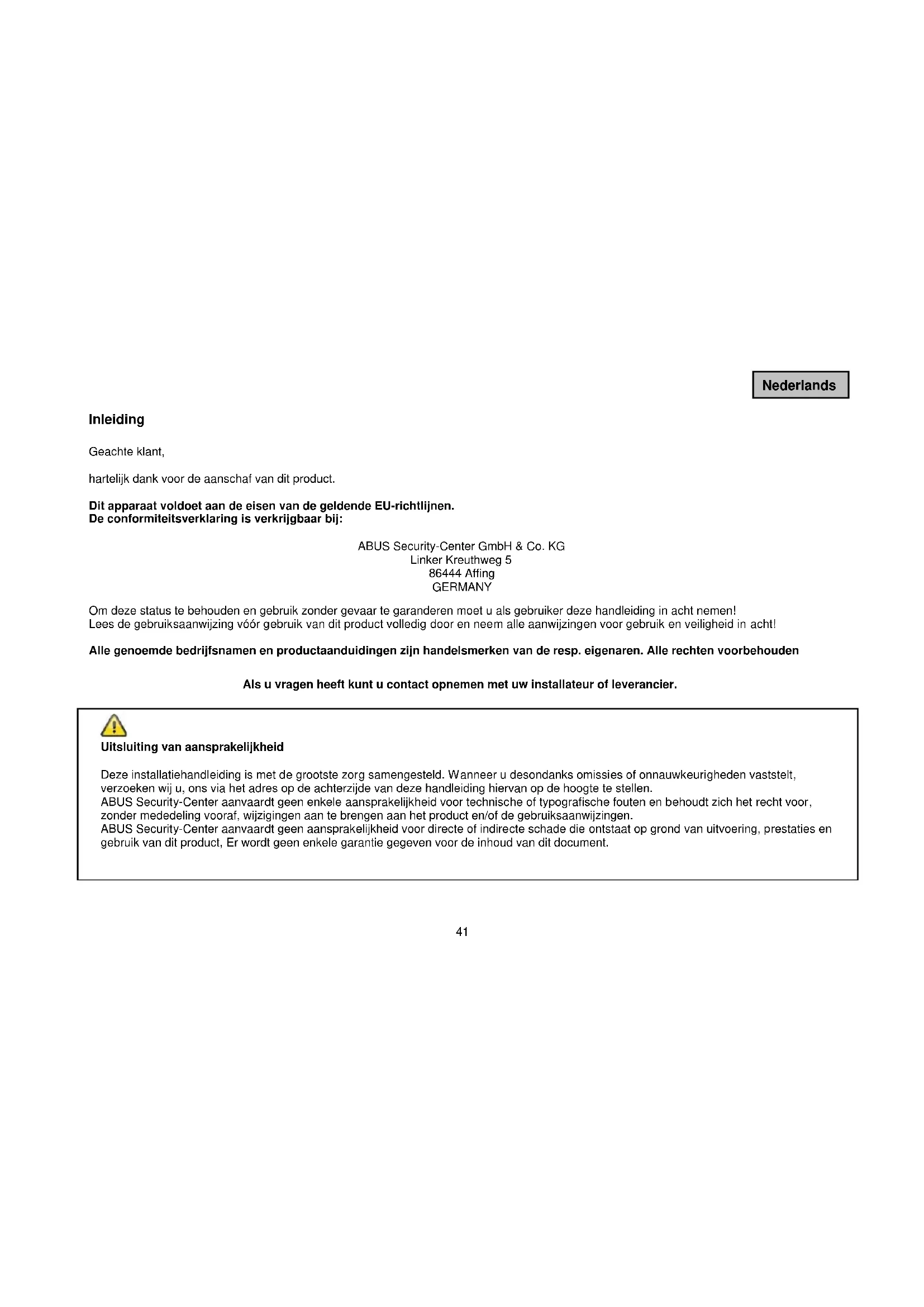 ABUS Security-Center aanvaardt geen aansprakelijkheid voor directe of indirecte schade die ontstaat op grond van uitvoering, prestaties en gebruik van dit product, Er worden geen enkele garantie geveen voor de inhoud van dit document.