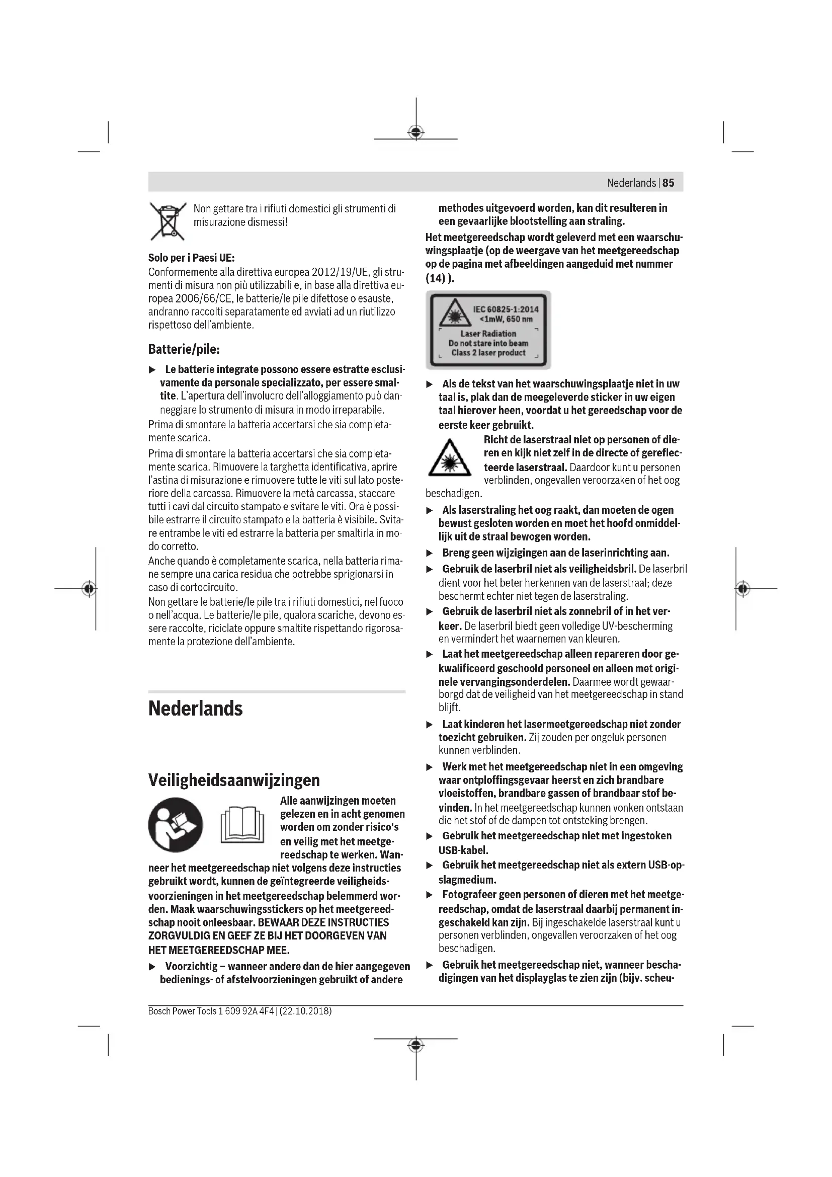 Berekening verdelen in tus- senstappen. Aanduiding „CAL“ en aanduiding „ERROR“ op het dis- play De kalibrering van de helling- meting is niet in de correcte volgorde of in de correcte posities uitgevoerd. Herhaal de kalibrering vol- gens de instructies op het display en in de gebruiksaan- wijzing. De voor de kalibrering ge- bruikte vlakken waren niet nauwkeurig horizontaal of verticaal uitgelijnd. Herhaal de kalibrering op een horizontaal of verticaal vlak en controleer de vlakken eerst met een waterpas. Het meetgereedschap is bij het indrukken van de toets bewogen of gekanteld. Herhaal de kalibrering en houd het meetgereedschap tijdens het indrukken van de toets rustig op het vlak. Accu-oplaadaanduiding (g), temperatuurwaarschuwing en aanduiding „ERROR“ op het display Temperatuur van het meet- gereedschap buiten het toe- gestane oplaadtemperatuur- bereik. Wacht tot het oplaadtempe- ratuurbereik is bereikt. Accu-oplaadaanduiding (g) en aanduiding „ERROR“ op het display Acculaadspanning niet cor- rect. Controleer of de steekverbin- ding correct tot stand is ge- Nederlands | 95 Bosch Power Tools 1 609 92A 4F4 | (22.10.2018)96 | Nederlands 1 609 92A 4F4 | (22.10.2018) Bosch Power Tools Oorzaak Oplossing bracht en het oplaadappa- raat correct functioneert. Als het toestelsymbool knippert, is de accu defect en moet de- ze door de Bosch-klantenser- vice worden vervangen. Meetresultaat niet aannemelijk Doeloppervlak reflecteert niet duidelijk (bijv. water, glas). Doeloppervlak afdekken. Uitgang laserstraal (18) of ontvangstlens (20) of came- ra (19) is afgedekt. Uitgang laserstraal (18), ont- vangstlens (20) of camera (19) vrijhouden. Verkeerd referentievlak inge- steld. Referentievlak passend bij de meting kiezen. Obstakel in het verloop van de laserstraal. Laserpunt moet volledig op doeloppervlak liggen. Bluetooth® kan niet worden geactiveerd Accu is te zwak. Laad de accu van het meet- gereedschap op. Geen Bluetooth®-verbinding Storing van de Bluetooth®- verbinding Schakel Bluetooth® op het meetgereedschap en op het mobiele eindapparaat uit en weer in. Controleer de applicatie op uw mobiele eindapparaat. Controleer of Bluetooth® op uw meetgereedschap en mo- biele eindapparaat geacti- veerd is. Controleer uw mobiele eind- apparaat op overbelasting. Verkort de afstand tussen het meetgereedschap en uw mobiele eindapparaat. Vermijd obstakels (bijv. ge- wapend beton, metalen deu- ren) tussen het meetgereed- schap en uw mobiele eindap- paraat. Houd afstand tot elektromagnetische storings- bronnen (bijv. WiFi-zen- ders). Geen gegevensoverdracht via USB-interface mogelijk Micro-USB-kabel Controleer of de micro-USB- kabel correct en vast zit. Controleer de micro-USB-ka- bel op beschadigingen. Het meetgereedschap bewaakt het correct functioneren bij elke meting. Wordt een defect vastgesteld, dan toont het display alleen nog het hiernaast afgebeelde symbool. In dit geval of wanneer de fout niet met de bovengenoem- de maatregelen kan worden verholpen, dient u het meetge- reedschap via uw leverancier naar de klantenservice van Bosch te sturen. Onderhoud en service Onderhoud en reiniging Houd het meetgereedschap altijd schoon. Dompel het meetgereedschap niet in water of andere vloei- stoffen. Verwijder vuil met een vochtige, zachte doek. Gebruik geen reinigings- of oplosmiddelen. Reinig vooral de ontvangstlens (20), de laseropening (18) en de camera (19) zeer voorzichtig: let erop dat er geen vuil op de ontvangstlens, de laseropening en de camera ligt. Rei- nig de ontvangstlens, de laseropening en de camera alleen met middelen die ook voor lenzen van fototoestellen ge- schikt zijn. Probeer niet met spitse voorwerpen vuil uit de ontvangstlens, de laseropening of de camera te verwijderen, en veeg niet over de ontvangstlens, laseropening en camera (gevaar voor krassen). Stuur het meetgereedschap voor reparatie in het opbergetui (24) op. Klantenservice en gebruiksadvies Onze klantenservice beantwoordt uw vragen over reparatie en onderhoud van uw product en over vervangingsonderde- len. Explosietekeningen en informatie over vervangingson- derdelen vindt u ook op: www.bosch-pt.com Het Bosch-gebruiksadviesteam helpt u graag bij vragen over onze producten en accessoires. Vermeld bij vragen en bestellingen van vervangingsonderde- len altijd het uit tien cijfers bestaande productnummer vol- gens het typeplaatje van het product. Nederland Tel.: (076) 579 54 54 Fax: (076) 579 54 94 E-mail: gereedschappen@nl.bosch.com België Tel.: (02) 588 0589 Fax: (02) 588 0595 E-mail: outillage.gereedschap@be.bosch.com Afvalverwijdering Meetgereedschappen, accessoires en verpakkingen dienen op een voor het milieu verantwoorde manier te worden gere- cycled. Gooi meetgereedschappen niet bij het huisvuil.Alleen voor landen van de EU: Volgens de Europese richtlijn 2012/19/EU moeten niet meer bruikbare meetgereedschappen en volgens de Europe- se richtlijn 2006/66/EG moeten defecte of verbruikte ac- cu’s/batterijen apart worden ingezameld en op een voor het milieu verantwoorde wijze worden gerecycled. Accu's/batterijen: u Geïntegreerde accu's mogen alleen voor het afvoeren door geschoold personeel verwijderd worden. Door het openen van de behuizingsschaal kan het meetgereed- schap vernietigd worden. Zorg er vóór het wegnemen van de accu voor dat de accu he- lemaal ontladen is. Zorg er vóór het wegnemen van de accu voor dat de accu he- lemaal ontladen is. Verwijder het typeplaatje, open de meet- pen en verwijder alle schroeven aan de achterkant van de behuizing. Pak de behuizingsschaal weg, koppel alle kabels van de printplaat los en draai de schroeven los. Nu kunt u de printplaat verwijderen en de accu is zichtbaar. Draai beide schroeven los en pak de accu weg om deze vakkundig af te voeren. Ook bij volledige ontlading is nog een restlading in de accu aanwezig die bij kortsluiting vrij kan komen. Gooi accu’s of batterijen niet bij het huisvuil en evenmin in het vuur of het water. Accu’s en batterijen moete