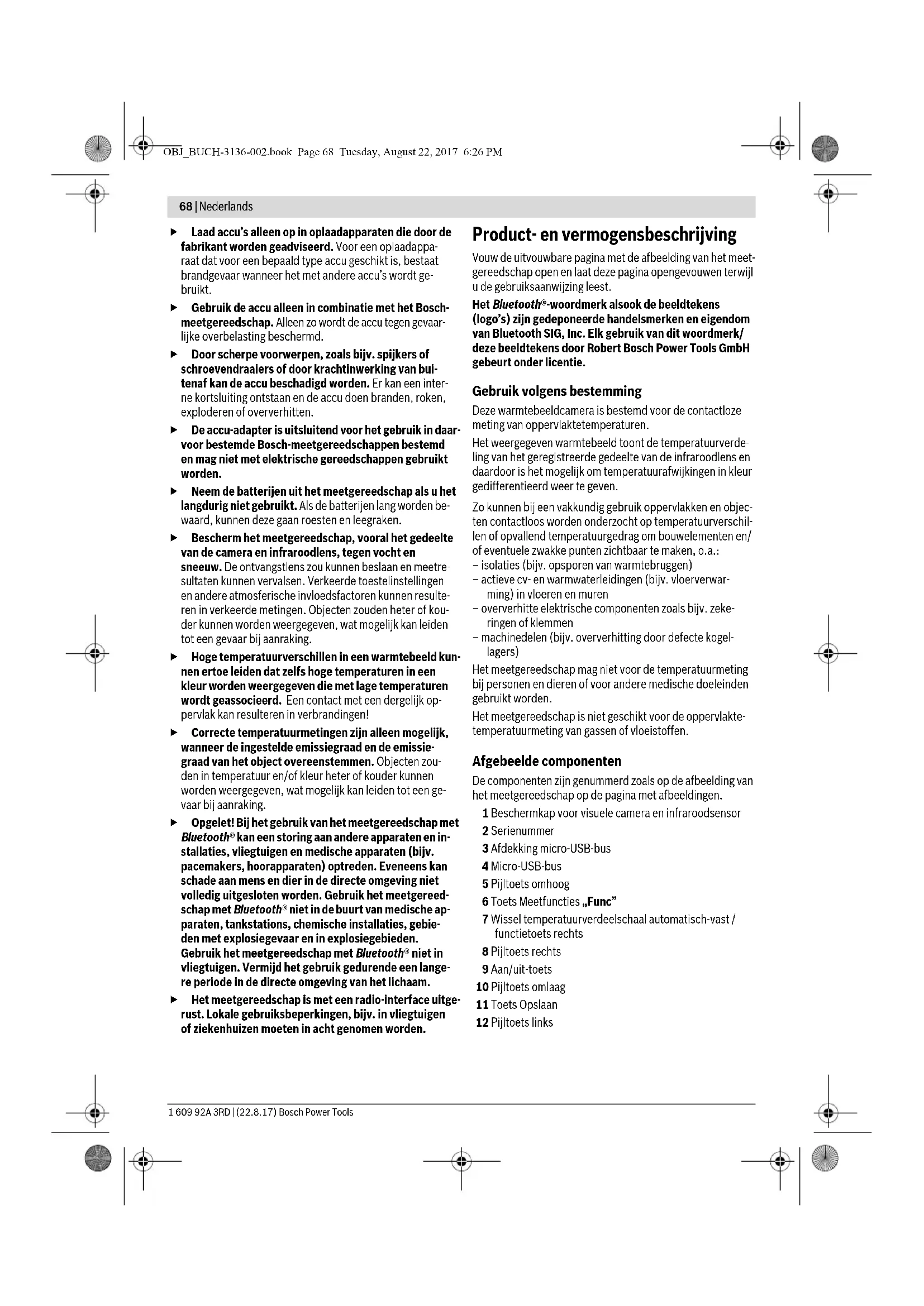 30 5,1 x 3,8 OBJ_BUCH-3136-002.book Page 66 Tuesday, August 22, 2017 6:26 PMNederlands | 67 Bosch Power Tools 1 609 92A 3RD | (22.8.17) Italia Officina Elettroutensili Robert Bosch S.p.A. Corso Europa 2/A 20020 LAINATE (MI) Tel.: (02) 3696 2663 Fax: (02) 3696 2662 Fax: (02) 3696 8677 E-Mail: officina.elettroutensili@it.bosch.com Svizzera Sul sito www.bosch-pt.com/ch/it è possible ordinare diretta- mente on-line i ricambi. Tel.: (044) 8471513 Fax: (044) 8471553 E-Mail: Aftersales.Service@de.bosch.com Trasporto Le batterie ricaricabili agli ioni di litio utilizzabili sono soggette ai requisiti di legge relativi a merci pericolose. Le batterie rica- ricabili possono essere trasportate su strada tramite l’utente senza ulteriori precauzioni. In caso di spedizione tramite terzi (p. es.: trasporto aereo op- pure spedizioniere) devono essere osservati particolari re- quisiti relativi ad imballo e marcatura. In questo caso per la preparazione del pezzo da spedire è necessario ricorrere ad un esperto per merce pericolosa. Spedire batterie ricaricabili solamente se la carcassa non è danneggiata. Coprire con nastro adesivo i contatti scoperti ed imballare la batteria ricaricabile in modo tale che non si muo- va nell’imballo. Vi preghiamo di osservare anche eventuali ulteriori norme na- zionali. Smaltimento Strumenti di misura, batterie/batterie ricaricabili, accessori e imballi dovranno essere smaltiti/riciclati nel rispetto dell’ambiente. Non gettare strumenti di misura e batterie ricarica- bili/batterie tra i rifiuti domestici! Solo per i Paesi della CE: Conformemente alla direttiva europea 2012/19/UE gli stru- menti di misura diventati inservibili e, in base alla direttiva eu- ropea 2006/66/CE, le batterie ricaricabili/ batterie difettose o consumate devono essere raccolte separatamente ed esse- re inviate ad una riutilizzazione ecologica. Per le batterie ricaricabili/le batterie non funzionanti rivol- gersi al Consorzio: Italia Ecoelit Viale Misurata 32 20146 Milano Tel.: +39 02 / 4 23 68 63 Fax: +39 02 / 48 95 18 93 Svizzera Batrec AG 3752 Wimmis BE Batterie ricaricabili/Batterie: Li-Ion: Si prega di tener presente le indicazioni riportare nel para- grafo «Trasporto», pagina 67. Con ogni riserva di modifiche tecniche. Nederlands Veiligheidsvoorschriften Alle aanwijzingen moeten gelezen en in acht genomen worden. Als het meetgereed- schap niet volgens de voorhanden aanwijzin- gen gebruikt wordt, kunnen de geïntegreerde veiligheidsinrichtingen in het meetgereed- schapa gevaar lopen. BEWAAR DEZE AANWIJ- ZINGEN ZORGVULDIG. Laat het meetgereedschap repareren door gekwalifi- ceerd, vakkundig personeel en alleen met originele vervangingsonderdelen. Daarmee wordt gewaarborgd dat de veiligheid van het meetgereedschap in stand blijft. Werk met het meetgereedschap niet in een omgeving met explosiegevaar waarin zich brandbare vloeistof- fen, brandbare gassen of brandbaar stof bevinden. In het meetgereedschap kunnen vonken ontstaan die het stof of de dampen tot ontsteking brengen. Haal de accu of de batterijen vóór alle werkzaamheden aan het meetgereedschap (bijv. montage, onderhoud etc.) alsook bij transport en bewaring uit het meetge- reedschap. Open de accu niet. Er bestaat gevaar voor kortsluiting. Bescherm de accu tegen hitte, bijv. ook tegen fel zonlicht, vuur, water en vocht. Er bestaat explosiegevaar. Voorkom aanraking van de niet-gebruikte accu met pa- perclips, munten, sleutels, spijkers, schroeven en an- dere kleine metalen voorwerpen die overbrugging van de contacten kunnen veroorzaken. Kortsluiting tussen de accucontacten kan brandwonden of brand tot gevolg hebben. Bij verkeerd gebruik kan vloeistof uit de accu lekken. Voorkom contact daarmee. Bij onvoorzien contact af- spoelen met water. Als de vloeistof in de ogen komt, dient u bovendien een arts te raadplegen. Gelekte accu- vloeistof kan tot huidirritaties en brandwonden leiden. Bij beschadiging en onjuist gebruik van de accu kunnen er dampen vrijkomen. Zorg voor frisse lucht en raad- pleeg bij klachten een arts. De dampen kunnen de lucht- wegen irriteren. OBJ_BUCH-3136-002.book Page 67 Tuesday, August 22, 2017 6:26 PM68 | Nederlands 1 609 92A 3RD | (22.8.17) Bosch Power Tools Laad accu’s alleen op in oplaadapparaten die door de fabrikant worden geadviseerd. Voor een oplaadappa- raat dat voor een bepaald type accu geschikt is, bestaat brandgevaar wanneer het met andere accu’s wordt ge- bruikt. Gebruik de accu alleen in combinatie met het Bosch- meetgereedschap. Alleen zo wordt de accu tegen gevaar- lijke overbelasting beschermd. Door scherpe voorwerpen, zoals bijv. spijkers of schroevendraaiers of door krachtinwerking van bui- tenaf kan de accu beschadigd worden. Er kan een inter- ne kortsluiting ontstaan en de accu doen branden, roken, exploderen of oververhitten. De accu-adapter is uitsluitend voor het gebruik in daar- voor bestemde Bosch-meetgereedschappen bestemd en mag niet met elektrische gereedschappen gebruikt worden. Neem de batterijen uit het meetgereedschap als u het langdurig niet gebruikt. Als de batterijen lang worden be- waard, kunnen deze gaan roesten en leegraken. Bescherm het meetgereedschap, vooral het gedeelte van de camera en infraroodlens, tegen vocht en sneeuw. De ontvangstlens zou kunnen beslaan en meetre- sultaten kunnen vervalsen. Verkeerde toestelinstellingen en andere atmosferische invloedsfactoren kunnen resulte- ren in verkeerde metingen. Objecten zouden heter of kou- der kunnen worden weergegeven, wat mogelijk kan leiden tot een gevaar bij aanraking. Hoge temperatuurverschillen in een warmtebeeld kun- nen ertoe leiden dat zelfs hoge temperaturen in een kleur worden weergegeven die met lage temperaturen wordt geassocieerd. Een contact met een dergelijk op- pervlak kan resulteren in verbrandingen! Correcte temperatuurmetingen zijn alleen mogelijk, wanneer de ingestelde emissiegraad en de emissie- graad van het object overeenstemmen. Objecten zou- den in temperatuur en/of kleur heter of kouder ku