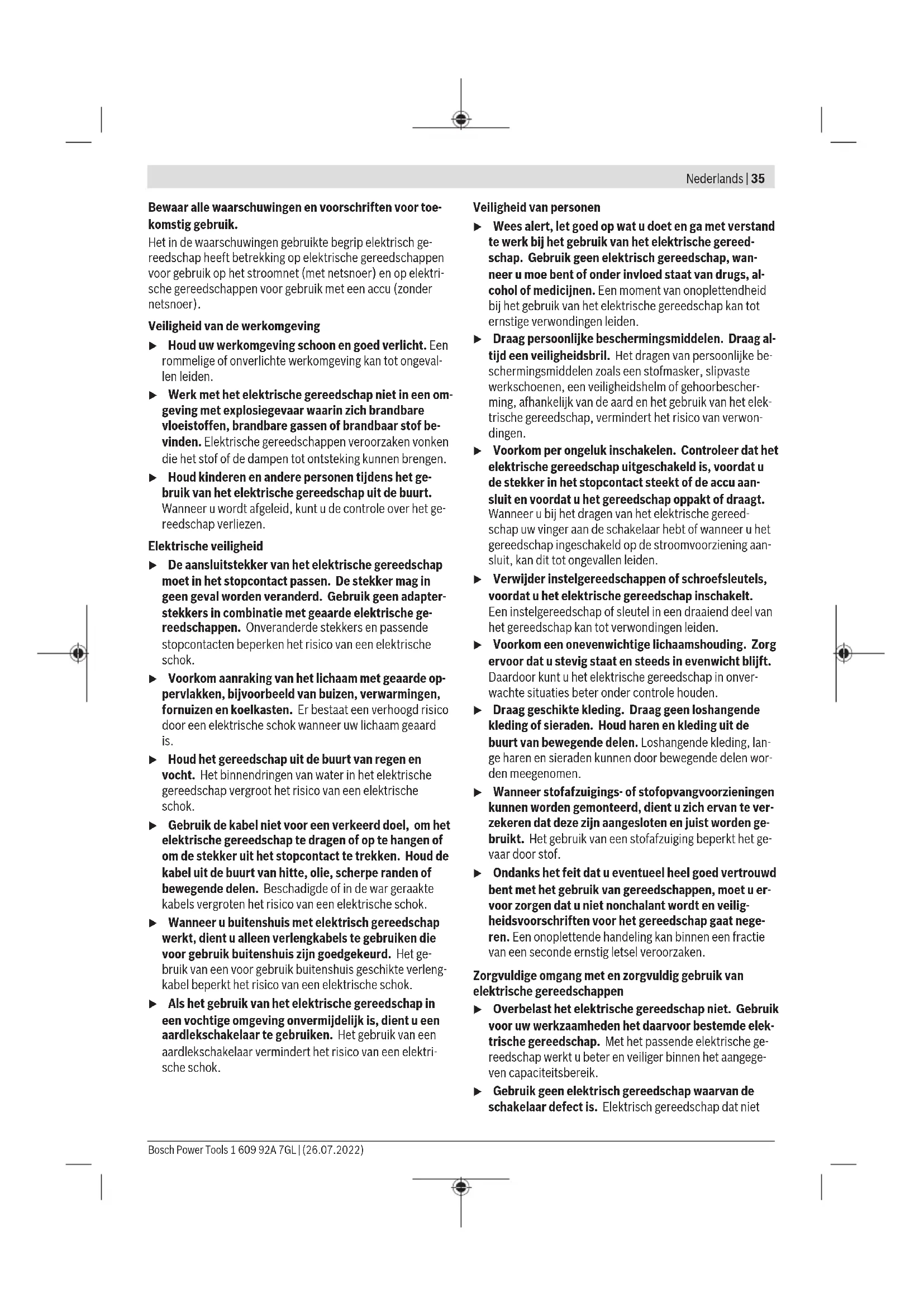 Il livello di vibrazione ed il valore di emissione acustica indi- cati nelle presenti istruzioni sono stati rilevati conformemen- te ad una procedura di misurazione unificata e sono utilizza- bili per confrontare gli elettroutensili. Le stesse procedure sono idonee anche per una valutazione temporanea del livel- lo di vibrazione e dell’emissione acustica. Il livello di vibrazione ed il valore di emissione acustica sono riferiti agli impieghi principali dell’elettroutensile; qualora, tuttavia, l’elettroutensile venisse utilizzato per altre applica- zioni, oppure con accessori differenti o in caso di insufficien- te manutenzione, il livello di vibrazione ed il valore di emis- sione acustica potrebbero variare. Ciò potrebbe aumentare sensibilmente l’emissione di vibrazioni e l’emissione acustica sull’intero periodo di funzionamento. Per valutare con precisione i valori di vibrazione e di emissio- ne acustica, andranno considerati anche i periodi nei quali l’utensile sia spento, oppure acceso, ma non utilizzato. Ciò potrebbe ridurre sensibilmente l’emissione di vibrazioni e l’emissione acustica sull’intero periodo di funzionamento. Adottare misure di sicurezza supplementari per proteggere l’operatore dall’effetto delle vibrazioni: ad esempio, sottopo- nendo a manutenzione l’elettroutensile e gli utensili accesso- ri, mantenendo calde le mani e organizzando i vari processi di lavoro. Montaggio u Prima di qualunque intervento sull’elettroutensile estrarre la spina di rete dalla presa. Impugnatura supplementare (vedere Fig. A) u Impiegare l’elettroutensile esclusivamente con l’impu- gnatura supplementare (2). Avvitare l’impugnatura supplementare (2) nella filettatura (3) sulla carcassa motore. Maniglia (vedere figura A) La maniglia (4) è ruotabile in modo continuo di 360°. Sostituzione dell’accessorio u Indossare guanti protettivi durante la sostituzione dell’accessorio. In caso di operazioni di lavoro di maggio- re durata il mandrino portapunta può surriscaldarsi. 1 609 92A 7GL | (26.07.2022) Bosch Power ToolsItaliano | 33 Mandrino a cremagliera con bloccaggio automatico (vedere Fig. B) Aprire il mandrino a cremagliera (1) ruotando, fino a quando sia possibile introdurre l’utensile accessorio. Inserire l’utensile. Innestare la chiave di serraggio per man- drini (9) negli appositi fori del mandrino a cremagliera (1) e serrare uniformemente l’utensile accessorio. Sostituzione del mandrino (vedere Fig. C) u Prima di qualunque intervento sull’elettroutensile estrarre la spina di rete dalla presa. Rimozione della vite di sicurezza Il mandrino a cremagliera (1) è protetto contro il distacco ac- cidentale dall’alberino da un’apposita vite di sicurezza (10). Aprire completamente il mandrino a cremagliera (1) e svita- re la vite di sicurezza (10) in senso orario. Nota bene: la vi- te di sicurezza ha filettatura sinistrorsa. Se la vite di sicurezza (10) è inceppata, applicare un caccia- vite sulla testa della vite stessa ed allentarla mediante un col- po sull’impugnatura del cacciavite. Smontaggio del mandrino autoserrante Per lo smontaggio del mandrino a cremagliera (1) inserire una chiave fissa (apertura chiave 17) sul dado e sul mandri- no di trasmissione. Tenere fermo con una mano il mandrino a cremagliera e gira- re con l’altra mano la chiave fissa in senso antiorario fino a quando il mandrino portapunta si stacca dal rispettivo cono. Montaggio del mandrino autoserrante u Tenere il cono del mandrino portapunta e la foratura del mandrino liberi da grasso e sporcizia. Per il montaggio del mandrino a cremagliera (1) svitare il da- do del mandrino di trasmissione procedendo in senso orario fino a battuta. Senza sforzare inserire il mandrino a cremagliera nel mandri- no di trasmissione fino a quando lo stesso ha una sede fissa. Con un martello di gomma assestare dei colpetti leggeri sulla parte frontale del mandrino a cremagliera (1), al fine di ga- rantire un sicuro inserimento in sede del mandrino a crema- gliera. Effettuando questa operazione prestare attenzione affinché le griffe del mandrino a cremagliera non sporgano per non danneggiare. Montaggio della vite di fissaggio Avvitare la vite di fissaggio (10) in senso antiorario nel man- drino a cremagliera aperto. Utilizzare in ogni occasione una vite di sicurezza nuova: sulla filettatura della vite è infatti ap- plicato un collante di fissaggio che perde effetto se la vite viene utilizzata più volte. Aspirazione polvere/aspirazione trucioli Polveri e materiali come vernici contenenti piombo, alcuni ti- pi di legname, minerali e metalli possono essere dannosi per la salute. Il contatto oppure l’inalazione delle polveri possono causare reazioni allergiche e/o malattie delle vie respiratorie dell’utilizzatore, oppure delle persone che si trovano nelle vi- cinanze. Determinate polveri come polvere da legname di faggio o di quercia sono considerate cancerogene, in modo particolare insieme ad additivi per il trattamento del legname (cromato, protezione per legno). Eventuale materiale contenente amianto andrà lavorato esclusivamente da personale specia- lizzato. – Provvedere ad una buona aerazione della postazione di lavoro. – Si consiglia di portare una mascherina protettiva con clas- se di filtraggio P2. Osservare le norme in vigore nel vostro Paese per i materiali da lavorare. u Evitare accumuli di polvere nella postazione di lavoro. Le polveri si possono incendiare facilmente. Uso Messa in funzione u Osservare la tensione di rete! La tensione riportata sulla targhetta di identificazione dell’elettroutensile deve corrispondere alla tensione della rete elettrica di alimentazione. Gli elettroutensili con l’indicazione di 230V possono essere collegati anche alla rete di 220V. Impostazione del senso di rotazione (vedere Fig. D) Il commutatore del senso di rotazione (7) consente di varia- re il senso di rotazione dell’elettroutensile. Ad interruttore di avvio/arresto (6) premuto, 