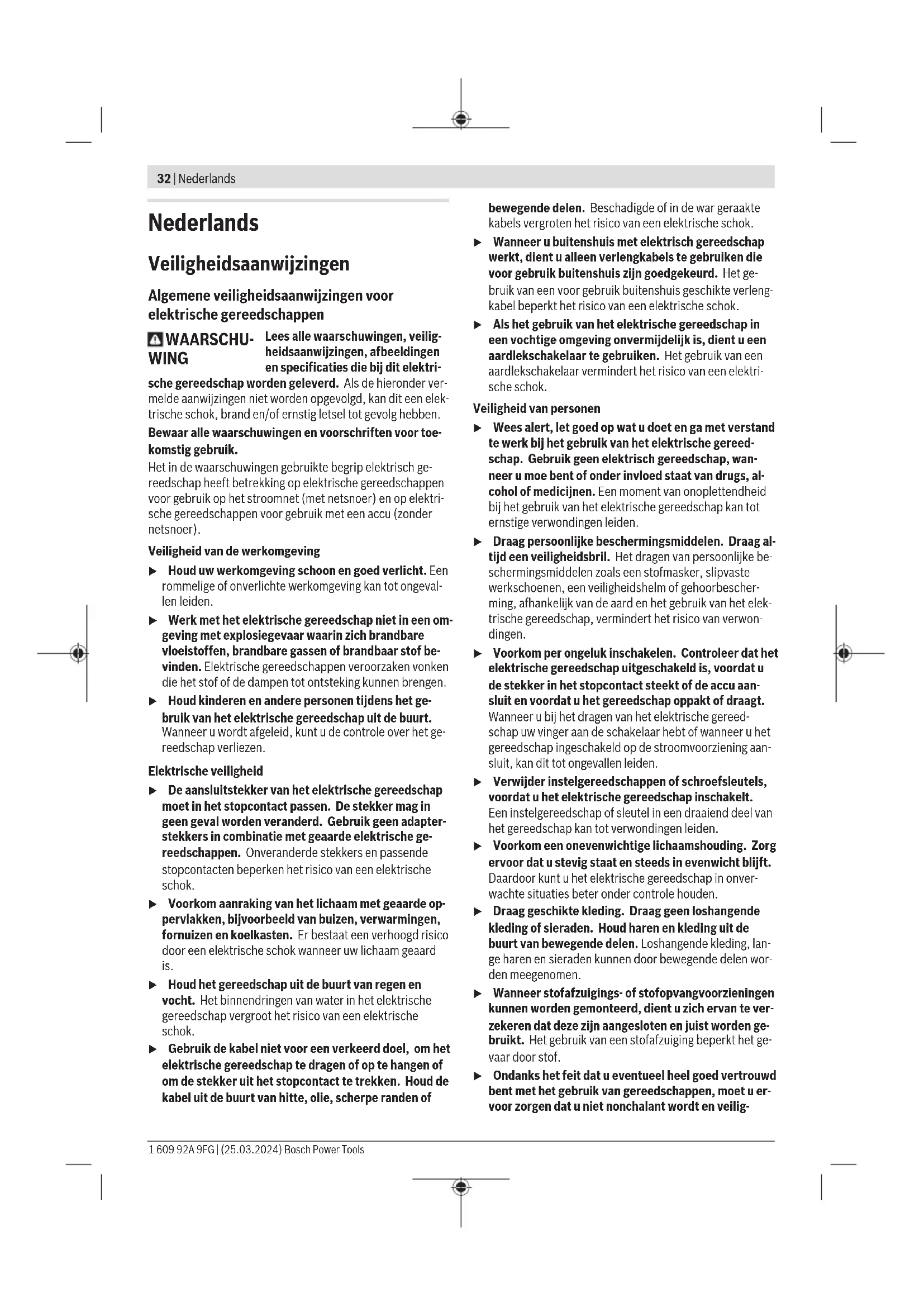 kg 5,8 Isolatieklasse /II A) Gewicht zonder netsnoer en zonder netstekker De gegevens gelden voor een nominale spanning [U] van 230 V. Bij afwijkende spanningen en in landspecifieke uitvoeringen kunnen deze gegevens variëren. Waarden kunnen afhankelijk van product variëren en onderhevig zijn aan toepassings- en omgevingsvoorwaarden. Meer informatie vindt u op www.bosch-professional.com/wac. Informatie over geluid en trillingen Geluidsemissiewaarden bepaald conform ENIEC62841-2-6. Het A-gewogen geluidsniveau van het elektrische gereed- schap bedraagt typisch: geluidsdrukniveau 92dB(A); ge- luidsvermogenniveau 100dB(A). Onzekerheid K = 3dB. Draag gehoorbescherming! Totale trillingswaarden a