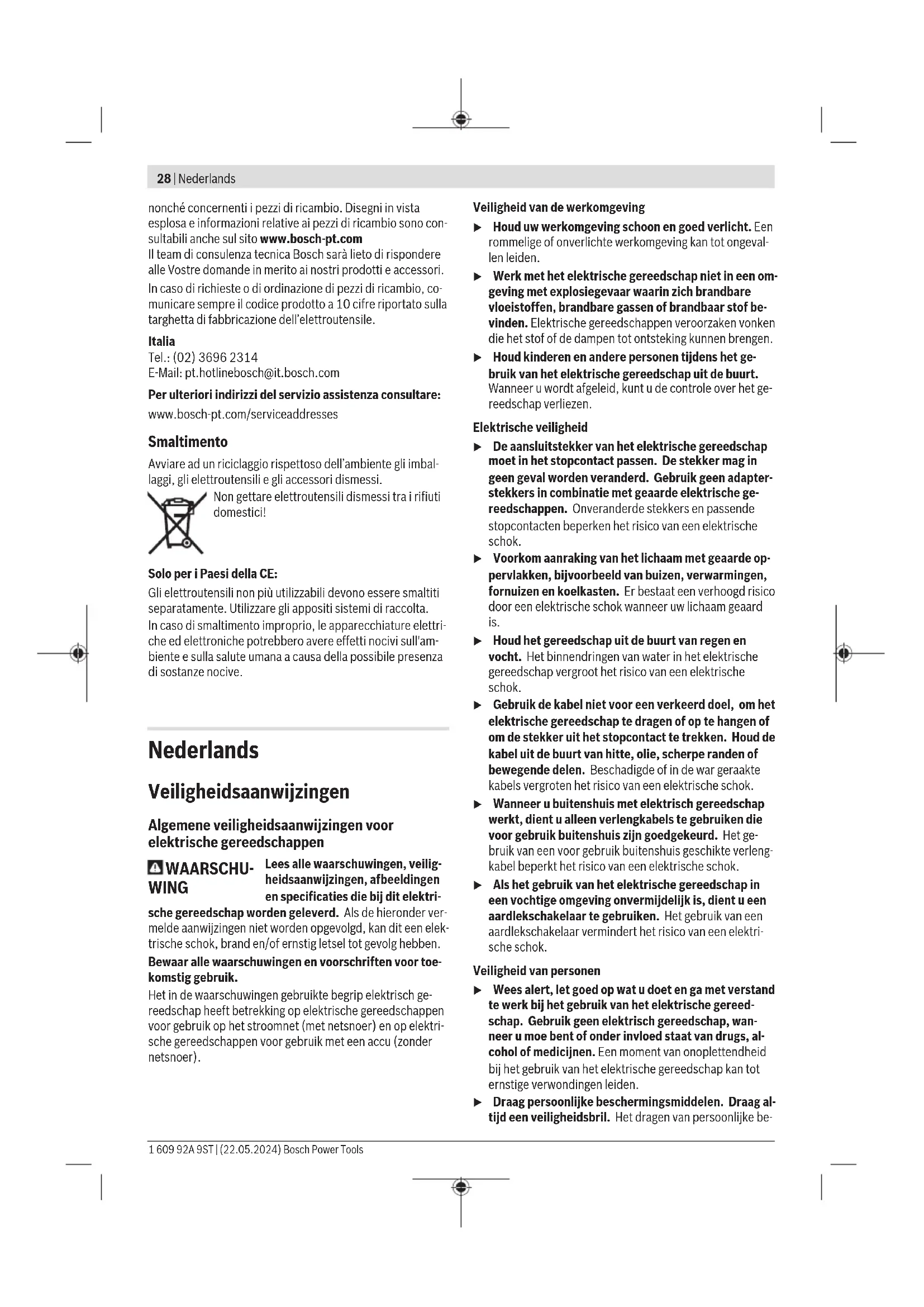 0,7 Alluminio 200 2,0 Ingrassaggio/raffreddamento del punzone Per prolungare la durata del punzone(6), si devono utilizza- re lubrificanti dotati di una buona funzione di raffreddamen- to (ad esempio olio da taglio). Applicare sulla parte superiore della lamiera, lungo la linea di taglio prevista, una traccia di lubrificante. Tagli su tracciato oppure con dima Per facilitare l’esecuzione di tagli diritti operare con l’elet- troutensile spingendolo lungo una riga. È possibile tagliare parti sagomate guidando l’elettroutensile lungo una dima. Per eseguire tagli all’interno della lamiera è necessario prati- care un preforo di 21mm di diametro. Manutenzione ed assistenza Manutenzione e pulizia u Prima di qualunque intervento sull’elettroutensile estrarre la spina di rete dalla presa. u Per poter garantire buone e sicure operazioni di lavo- ro, tenere sempre pulite l’elettroutensile e le fessure di ventilazione. Se fosse necessaria una sostituzione della linea di collega- mento, questa dovrà essere eseguita da Bosch oppure da un centro assistenza clienti autorizzato per elettroutensili Bosch, al fine di evitare pericoli per la sicurezza. Pulire ed oliare il punzone(6) e la matrice(7) ogni 3 ore d’esercizio. In caso di usura sostituire in tempo utile il punzone e la matri- ce perché soltanto utensili affilati possono portare buone prestazioni di taglio senza sottoporre l’elettroutensile ad inu- tile usura. Il punzone(6) e la matrice(7) non devono essere riaffilati. Sostituzione della matrice Svitare la vite a testa zigrinata(9) dal portamatrice(5). Ri- muove-re la matrice(7). All’occorrenza, pulire il portamatrice(5). Inserire una matrice(7) nuova e ben oliata nel portamatrice, facendo at- tenzione all’allineamento del lato abbassato. Avvitare nuovamente la vite zigrinata(9), con l’anello in gomma(8) inserito. Serrare la vite, mediante una chiave a brugola, in senso contrario alla resistenza dell’anello in gom- ma (3−4Nm). Sostituzione del punzone Allentare la vite(2) del portamatrice e rimuovere completa- mente il portamatrice(5) stesso dalla carcassa. Spingere il punzone(6) lateralmente all’esterno dell’attacco ed estrarlo verso il basso. Inserire un punzone(6) nuovo e ben oliato nella scanalatura dell’attacco e allinearlo al centro. Spingere indietro, con cautela, il portamatrice(5) sopra il punzone nella carcassa. Ruotare il portamatrice in una delle tre posizioni possibili, in base alla direzione di taglio deside- rata. Serrare saldamente la vite(2) del portamatrice. Servizio di assistenza e consulenza tecnica Il servizio di assistenza risponde alle Vostre domande relati- ve alla riparazione e alla manutenzione del Vostro prodotto Bosch Power Tools 1 609 92A 9ST | (22.05.2024)28 | Nederlands nonché concernenti i pezzi di ricambio. Disegni in vista esplosa e informazioni relative ai pezzi di ricambio sono con- sultabili anche sul sito www.bosch-pt.com Il team di consulenza tecnica Bosch sarà lieto di rispondere alle Vostre domande in merito ai nostri prodotti e accessori. In caso di richieste o di ordinazione di pezzi di ricambio, co- municare sempre il codice prodotto a 10cifre riportato sulla targhetta di fabbricazione dell’elettroutensile. Italia Tel.: (02) 3696 2314 E-Mail: pt.hotlinebosch@it.bosch.com Per ulteriori indirizzi del servizio assistenza consultare: www.bosch-pt.com/serviceaddresses Smaltimento Avviare ad un riciclaggio rispettoso dell’ambiente gli imbal- laggi, gli elettroutensili e gli accessori dismessi. Non gettare elettroutensili dismessi tra i rifiuti domestici! Solo per i Paesi dellaCE: Gli elettroutensili non più utilizzabili devono essere smaltiti separatamente. Utilizzare gli appositi sistemi di raccolta. In caso di smaltimento improprio, le apparecchiature elettri- che ed elettroniche potrebbero avere effetti nocivi sull'am- biente e sulla salute umana a causa della possibile presenza di sostanze nocive. Nederlands Veiligheidsaanwijzingen Algemene veiligheidsaanwijzingen voor elektrische gereedschappen WAARSCHU- WING Lees alle waarschuwingen, veilig- heidsaanwijzingen, afbeeldingen en specificaties die bij dit elektri- sche gereedschap worden geleverd. Als de hieronder ver- melde aanwijzingen niet worden opgevolgd, kan dit een elek- trische schok, brand en/of ernstig letsel tot gevolg hebben. Bewaar alle waarschuwingen en voorschriften voor toe- komstig gebruik. Het in de waarschuwingen gebruikte begrip elektrisch ge- reedschap heeft betrekking op elektrische gereedschappen voor gebruik op het stroomnet (met netsnoer) en op elektri- sche gereedschappen voor gebruik met een accu (zonder netsnoer). Veiligheid van de werkomgeving u Houd uw werkomgeving schoon en goed verlicht. Een rommelige of onverlichte werkomgeving kan tot ongeval- len leiden. u Werk met het elektrische gereedschap niet in een om- geving met explosiegevaar waarin zich brandbare vloeistoffen, brandbare gassen of brandbaar stof be- vinden. Elektrische gereedschappen veroorzaken vonken die het stof of de dampen tot ontsteking kunnen brengen. u Houd kinderen en andere personen tijdens het ge- bruik van het elektrische gereedschap uit de buurt. Wanneer u wordt afgeleid, kunt u de controle over het ge- reedschap verliezen. Elektrische veiligheid u De aansluitstekker van het elektrische gereedschap moet in het stopcontact passen. De stekker mag in geen geval worden veranderd. Gebruik geen adapter- stekkers in combinatie met geaarde elektrische ge- reedschappen. Onveranderde stekkers en passende stopcontacten beperken het risico van een elektrische schok. u Voorkom aanraking van het lichaam met geaarde op- pervlakken, bijvoorbeeld van buizen, verwarmingen, fornuizen en koelkasten. Er bestaat een verhoogd risico door een elektrische schok wanneer uw lichaam geaard is. u Houd het gereedschap uit de buurt van regen en vocht. Het binnendringen van water in het elektrische gereedschap vergroot het risico van een elektrische schok. u Gebruik de kabel niet voor een ver