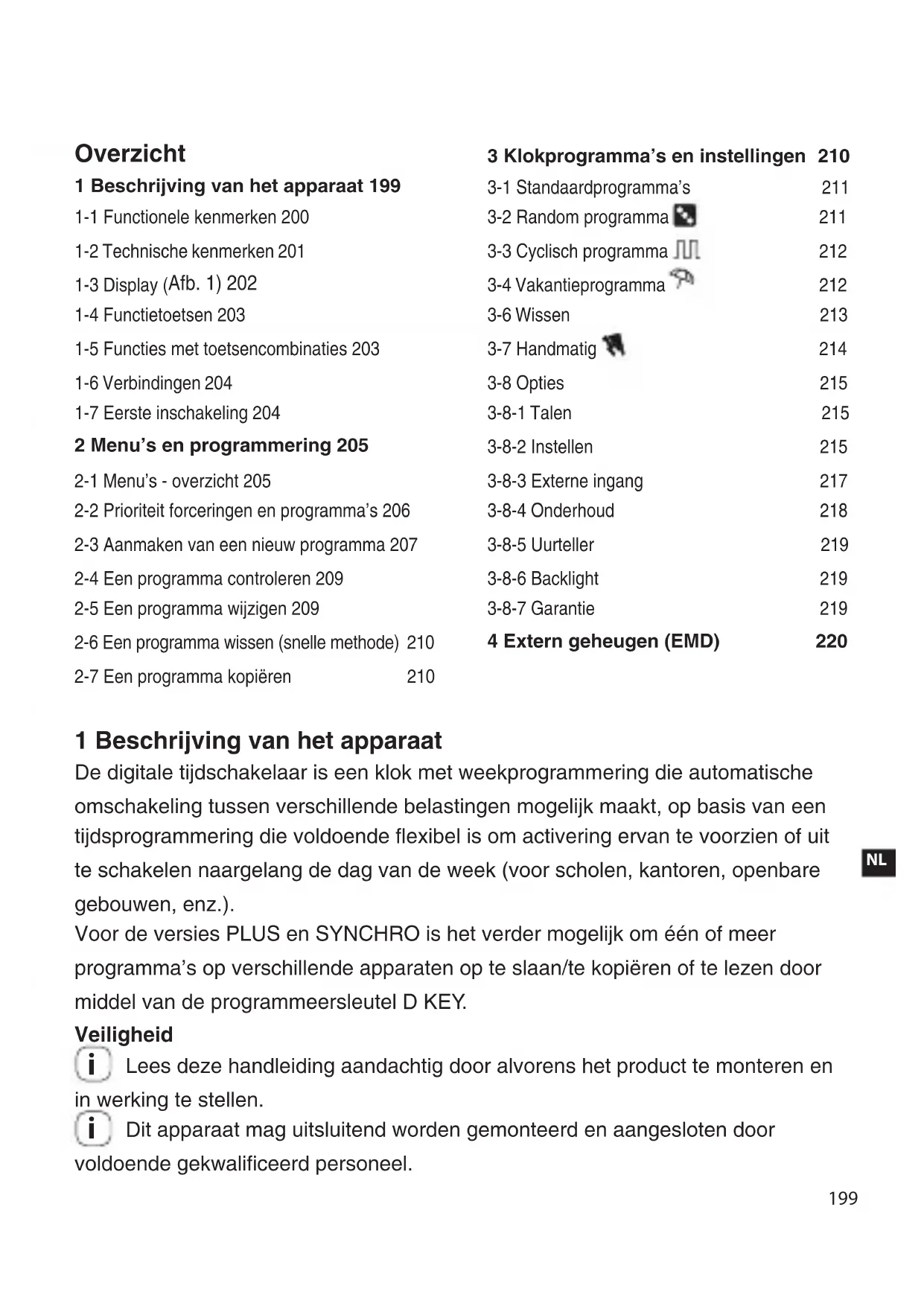3-8 Opties 215 3-8-1 Talen 215 3-8-2 Instellen 215 3-8-3 Externe ingang 217 3-8-4 Onderhoud 218 3-8-5 Uurteller 219 3-8-6 Backlight 219 3-8-7 Garantie 219 4 Extern geheugen (EMD) 220 1 Beschrijving van het apparaat De digitale tijdschakelaar is een klok met weekprogrammering die automatische omschakeling tussen verschillende belastingen mogelijk maakt, op basis van een tijdsprogrammering die voldoende flexibel is om activering ervan te voorzien of uit te schakelen naargelang de dag van de week (voor scholen, kantoren, openbare gebouwen, enz.). Voor de versies PLUS en SYNCHRO is het verder mogelijk om één of meer programma’s op verschillende apparaten op te slaan/te kopiëren of te lezen door middel van de programmeersleutel D KEY. Veiligheid Lees deze handleiding aandachtig door alvorens het product te monteren en in werking te stellen. Dit apparaat mag uitsluitend worden gemonteerd en aangesloten door voldoende gekwalificeerd personeel.