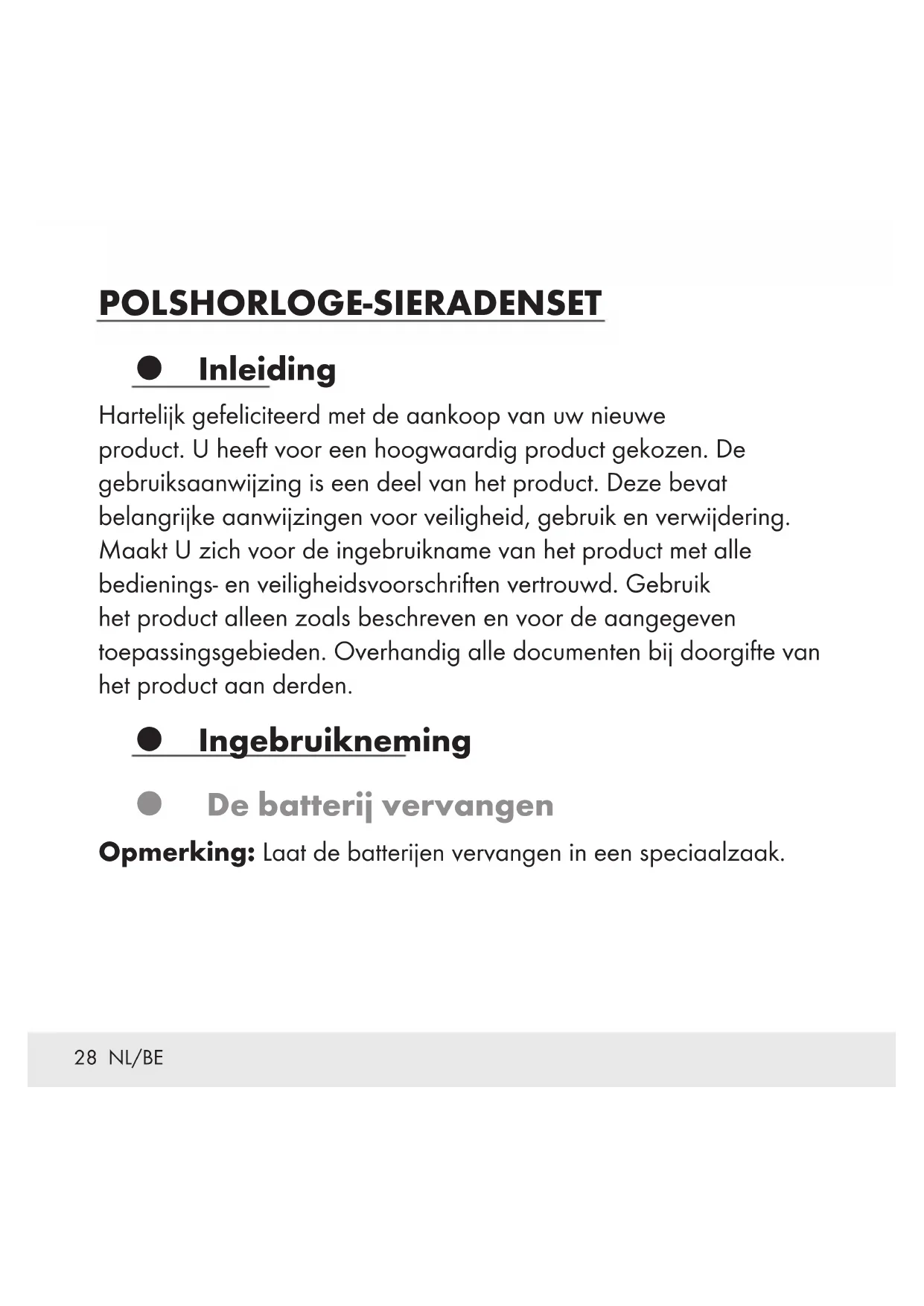 Haal de oude stift voorzichtig uit de schuiver met behulp van een tang. Gebruik nogmaals de tang om de reservestift voorzichtig in de schuiver te brengen. De nieuwe stift is geïnstalleerd. Reiniging en onderhoud Reinig het product alleen aan de buitenzijde met een zachte, droge doek. Verwijdering De verpakking bestaat uit milieuvriendelijke grondstoffen die u via de plaatselijke recyclingcontainers kunt afvoeren. De Grüne Punkt geldt niet voor Duitsland.33 NL/BE Neem de aanduiding van de verpakkingsmaterialen voor de afvalscheiding in acht. Deze zijn gemarkeerd met de afkortingen (a) en een cijfers (b) met de volgende betekenis: 1–7: kunststoffen / 20–22: papier en vezelplaten / 80–98: composietmaterialen. Het product en de verpakkingsmaterialen zijn recyclebaar; verwijder deze afzonderlijk voor een betere afvalbehandeling. Het Triman-logo geldt alleen voor Frankrijk. Informatie over de mogelijkheden om het uitgediende product na gebruik te verwijderen, verstrekt uw gemeentelijke overheid. Gooi het afgedankte product omwille van het milieu niet weg via het huisvuil, maar geef het af bij het daarvoor bestemde depot of het gemeentelijke milieupark. Over afgifteplaatsen en hun openingstijden kunt u zich bij uw aangewezen instantie informeren.34 NL/BE Defecte of gebruikte batterijen / oplaadbare batterijen moeten volgens de richtlijn 2006/66/EG en diens wijzigingen worden gerecycled. Lever de batterijen / oplaadbare batterijen en / of het product in bij een erkend inzamelpunt. Milieuschade door verkeerde afvoer van batterijen / oplaadbare batterijen! Batterijen / oplaadbare batterijen mogen niet samen met het gewone huisvuil worden weggegooid. Ze kunnen giftig zwaar metaal bevatten en moeten worden behandeld als gevaarlijk afval. De chemische symbolen van de zware metalen zijn als volgt: Cd = cadmium, Hg = kwikzilver, Pb = lood. Lever uw gebruikte batterijen / oplaadbare batterijen aldus in bij een gemeentelijk inzamelpunt. Garantie Het product wordt volgens strenge kwaliteitsrichtlijnen zorgvuldig geproduceerd en voor levering grondig getest. In geval van schade aan het product kunt u rechtmatig beroep doen op de verkoper van het product. Deze wettelijke rechten worden door onze hierna vermelde garantie niet beperkt.35 NL/BE Op dit product verlenen wij 3 jaar garantie vanaf aankoopdatum. De garantieperiode start op de dag van aankoop. Bewaar de originele kassabon alstublieft. Dit document is nodig als bewijs voor aankoop. Wanneer binnen 3 jaar na de aankoopdatum van dit product een materiaal- of productiefout optreedt, dan wordt het product door ons – naar onze keuze – gratis voor u gerepareerd of vervangen. Deze garantie komt te vervallen als het product beschadigd wordt, niet correct gebruikt of onderhouden wordt. De garantie geldt voor materiaal- en productiefouten. Deze garantie is niet van toepassing op productonderdelen, die onderhevig zijn aan normale slijtage en hierdoor als aan slijtage onderhevige onderdelen gelden (bijv. batterijen) of voor beschadigingen aan breekbare onderdelen, zoals bijv. schakelaars, accu’s of dergelijke onderdelen, die gemaakt zijn van glas. Het verminderen van de waterdichtheid valt eveneens niet onder de garantie. De toestand van de waterdichtheid is geen voortdurende eigenschap en dient daarom regelmatig onderhouden te worden. Houd er alstublieft rekening mee, dat door het openen en repareren van uw horloge door personen, die hiertoe niet gemachtigd zijn, uw garantie komt te vervallen.36 DE/AT/CH ARMBANDUHR-SCHMUCKSET Einleitung Wir beglückwünschen Sie zum Kauf Ihres neuen Produkts. Sie haben sich damit für ein hochwertiges Produkt entschieden. Die Bedienungsanleitung ist Teil dieses Produkts. Sie enthält wichtige Hinweise für Sicherheit, Gebrauch und Entsorgung. Machen Sie sich vor der Benutzung des Produkts mit allen Bedien- und Sicherheitshinweisen vertraut. Benutzen Sie das Produkt nur wie beschrieben und für die angegebenen Einsatzbereiche. Händigen Sie alle Unterlagen bei Weitergabe des Produkts an Dritte mit aus. Inbetriebnahme Batterie wechseln Hinweis: Wenden Sie sich zum Wechseln der Batterie an ein Fachgeschäft.37 DE/AT/CH Anzeige