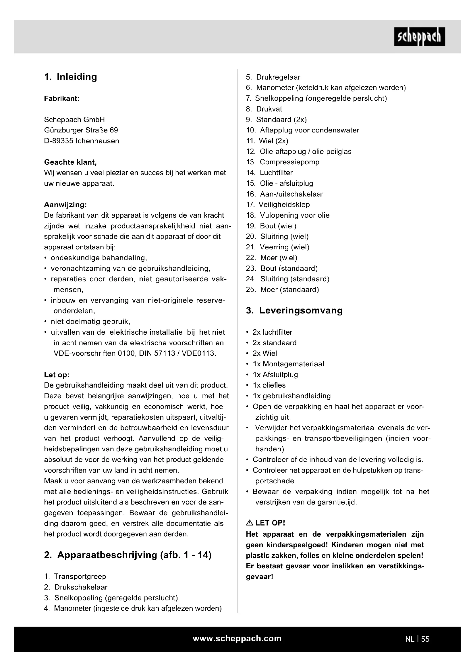 Fabrikant: Scheppach GmbH Günzburger Straße 69 D-89335 Ichenhausen Geachte klant, Wij wensen u veel plezier en succes bij het werken met uw nieuwe apparaat. Aanwijzing: De fabrikant van dit apparaat is volgens de van kracht zijnde wet inzake productaansprakelijkheid niet aan- sprakelijk voor schade die aan dit apparaat of door dit apparaat ontstaan bij: