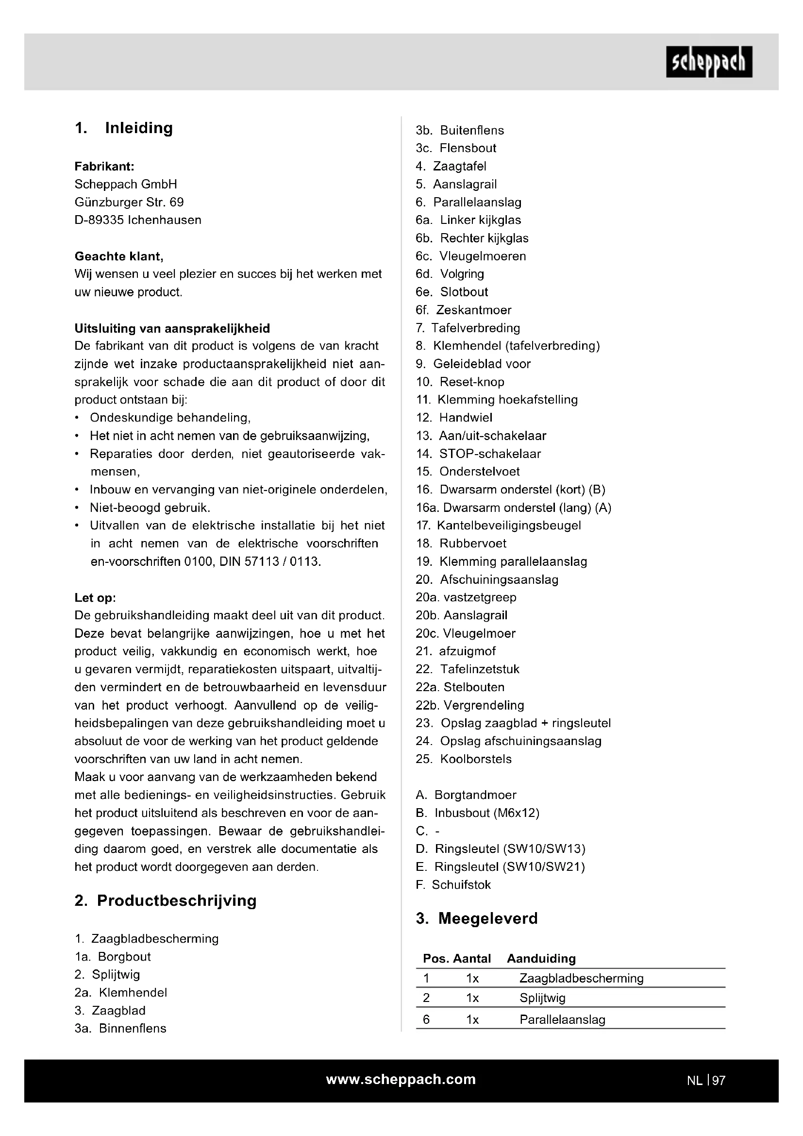 Fabrikant: Scheppach GmbH Günzburger Str. 69 D-89335 Ichenhausen Geachte klant, Wij wensen u veel plezier en succes bij het werken met uw nieuwe product. Uitsluiting van aansprakelijkheid De fabrikant van dit product is volgens de van kracht zijnde wet inzake productaansprakelijkheid niet aan- sprakelijk voor schade die aan dit product of door dit product ontstaan bij: