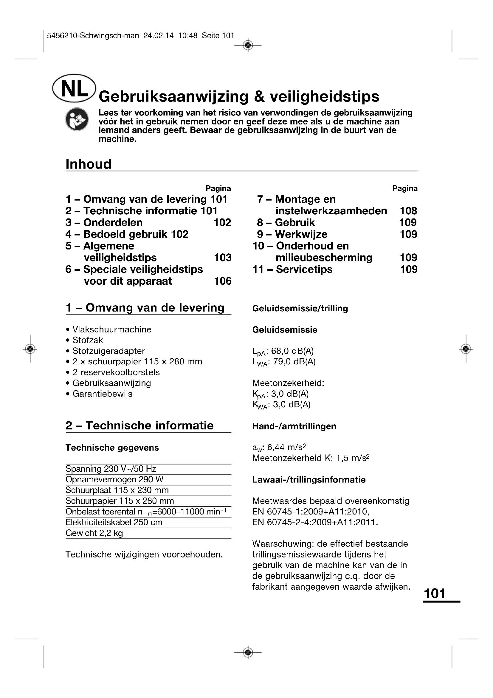 | 5 - Algemene veiligheidstips | 103 | 10 - Onderhoud en milieuubescherming | 109 |