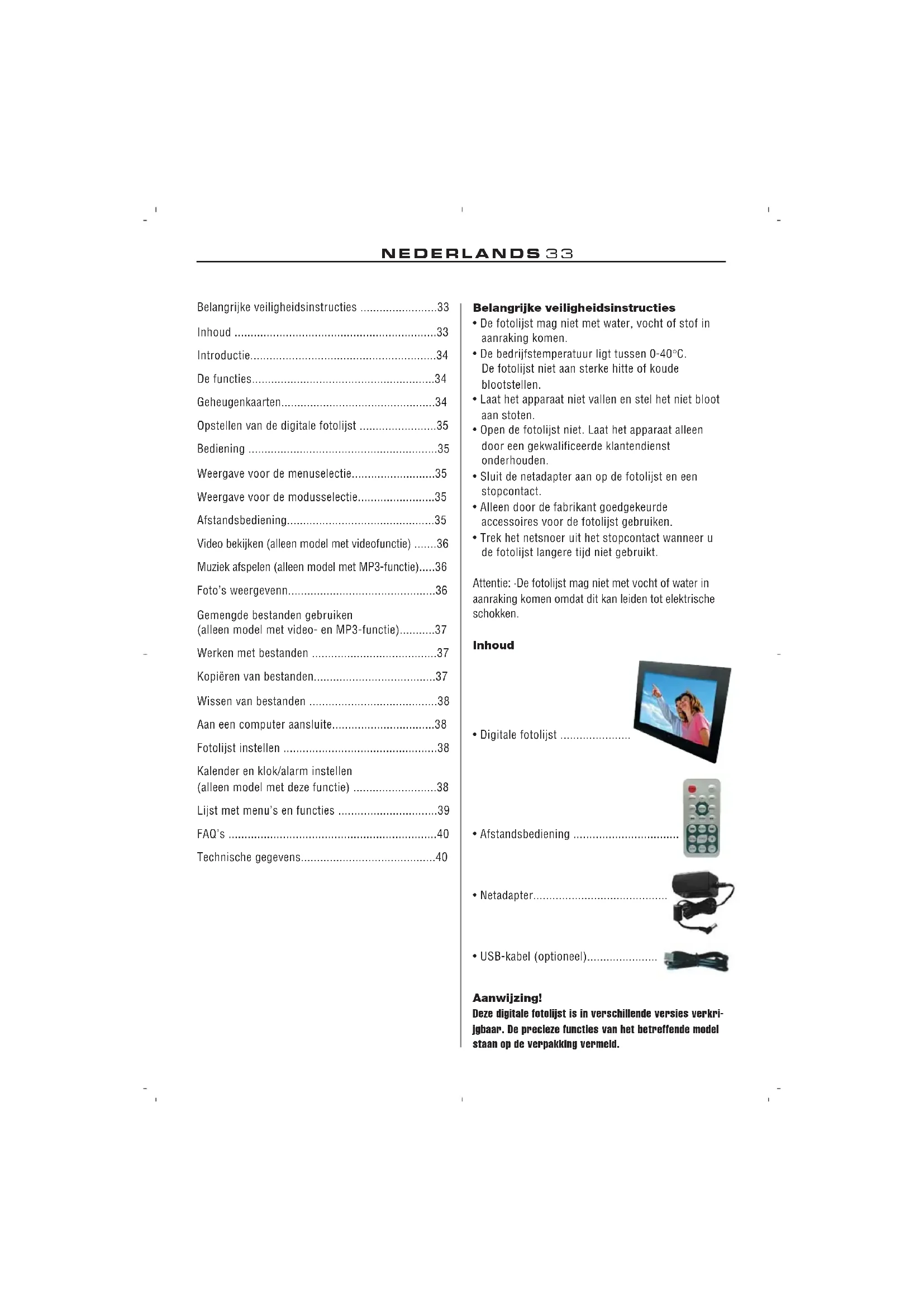 - USB-kabel (optioneel).......................................... Aanwijzing! Deze digitale fotolijst is in verschillende versies verkri- jgbaar. De precieze functies van het betreffende model staan op de verpakking vermeld.NEDERLANDS34 Introductie Hartelijk gefeliciteerd met de aankoop van uw DigiFrame! Met dit apparaat kunt u uw digitalen foto’s direct van een geheugenkaart bekijken, zonder gebruik te maken van een computer. Plaats gewoon uw geheugenkaart in de DigiFrame, schakel deze aan en u ziet uw foto’s direct in een diapresentatie. Zo gemakkelijk is dat! Met de DigiFrame kunt u afzonderlijke foto’s beki- jken, videoclips afspelen of achtergrondmuziek bij een diapresentatie weergeven (alleen model met video- en MP3-functie). Lees deze gebruiksaanwijzing zorgvuldig door om alle functies van uw nieuwe DigiFrame te leren ken- nen en optimaal te kunnen gebruiken. Aanwijzing! Deze DigiFrame is in verschillende versies verkri- jgbaar. De precieze functies van het betreffende DigiFrame-model staan op de verpakking vermeld. De functies:
