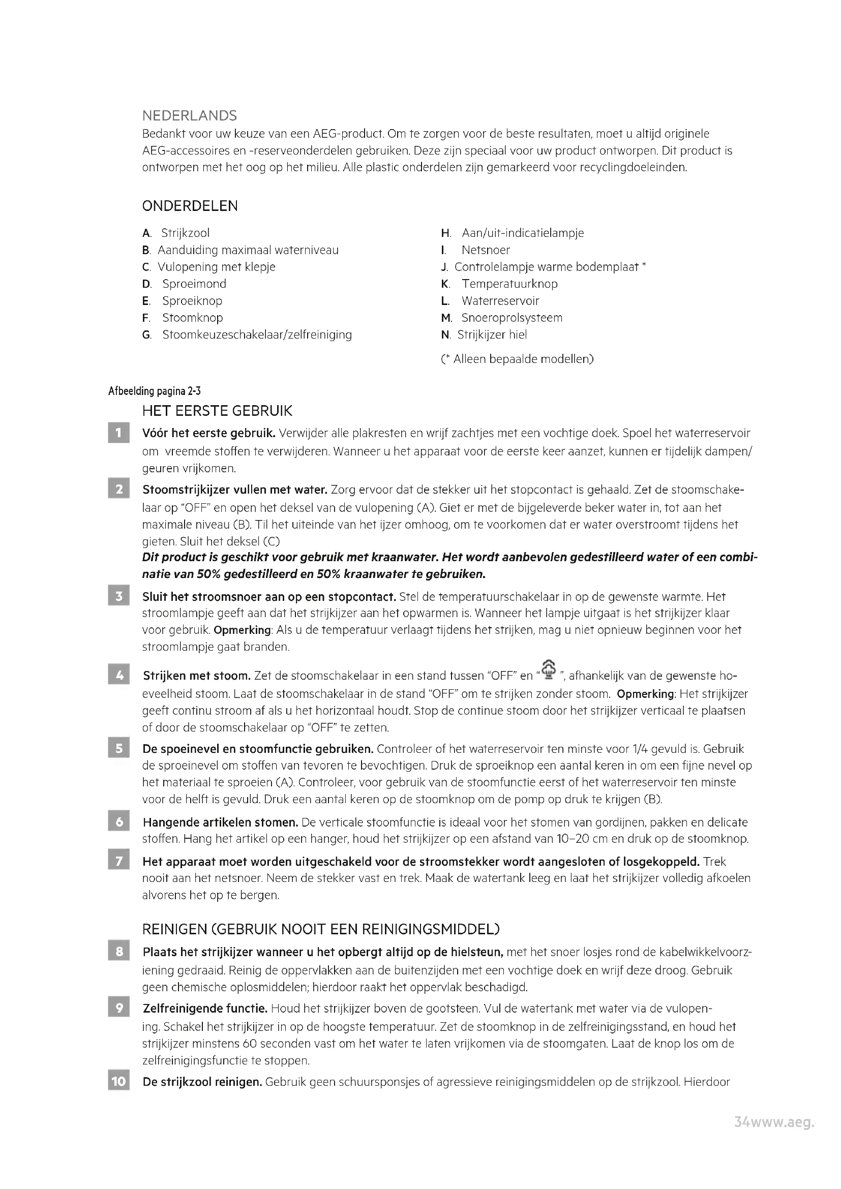 1 Vóór het eerste gebruik. Verwijder alle plakresten en wrijf zachtjes met een vochtige doek. Spoel het waterreservoir om vreemde stoen te verwijderen. Wanneer u het apparaat voor de eerste keer aanzet, kunnen er tijdelijk dampen/ geuren vrijkomen. 2 Stoomstrijkijzer vullen met water. Zorg ervoor dat de stekker uit het stopcontact is gehaald. Zet de stoomschake- laar op “OFF” en open het deksel van de vulopening (A). Giet er met de bijgeleverde beker water in, tot aan het maximale niveau (B). Til het uiteinde van het ijzer omhoog, om te voorkomen dat er water overstroomt tijdens het gieten. Sluit het deksel (C) Dit product is geschikt voor gebruik met kraanwater. Het wordt aanbevolen gedestilleerd water of een combi- natie van 50% gedestilleerd en 50% kraanwater te gebruiken. 3 Sluit het stroomsnoer aan op een stopcontact. Stel de temperatuurschakelaar in op de gewenste warmte. Het stroomlampje geeft aan dat het strijkijzer aan het opwarmen is. Wanneer het lampje uitgaat is het strijkijzer klaar voor gebruik. Opmerking: Als u de temperatuur verlaagt tijdens het strijken, mag u niet opnieuw beginnen voor het stroomlampje gaat branden. 4 Strijken met stoom. Zet de stoomschakelaar in een stand tussen “OFF” en “ ”, afhankelijk van de gewenste ho- eveelheid stoom. Laat de stoomschakelaar in de stand “OFF” om te strijken zonder stoom. Opmerking: Het strijkijzer geeft continu stroom af als u het horizontaal houdt. Stop de continue stoom door het strijkijzer verticaal te plaatsen of door de stoomschakelaar op “OFF” te zetten. 5 De spoeinevel en stoomfunctie gebruiken. Controleer of het waterreservoir ten minste voor 1/4 gevuld is. Gebruik de sproeinevel om stoen van tevoren te bevochtigen. Druk de sproeiknop een aantal keren in om een jne nevel op het materiaal te sproeien (A). Controleer, voor gebruik van de stoomfunctie eerst of het waterreservoir ten minste voor de helft is gevuld. Druk een aantal keren op de stoomknop om de pomp op druk te krijgen (B). 6 Hangende artikelen stomen. De verticale stoomfunctie is ideaal voor het stomen van gordijnen, pakken en delicate stoen. Hang het artikel op een hanger, houd het strijkijzer op een afstand van 10–20 cm en druk op de stoomknop. 7 Het apparaat moet worden uitgeschakeld voor de stroomstekker wordt aangesloten of losgekoppeld. Trek nooit aan het netsnoer. Neem de stekker vast en trek. Maak de watertank leeg en laat het strijkijzer volledig afkoelen alvorens het op te bergen. REINIGEN (GEBRUIK NOOIT EEN REINIGINGSMIDDEL) 8 Plaats het strijkijzer wanneer u het opbergt altijd op de hielsteun, met het snoer losjes rond de kabelwikkelvoorz- iening gedraaid. Reinig de oppervlakken aan de buitenzijden met een vochtige doek en wrijf deze droog. Gebruik geen chemische oplosmiddelen; hierdoor raakt het oppervlak beschadigd. 9 Zelfreinigende functie. Houd het strijkijzer boven de gootsteen. Vul de watertank met water via de vulopen- ing. Schakel het strijkijzer in op de hoogste temperatuur. Zet de stoomknop in de zelfreinigingsstand, en houd het strijkijzer minstens 60 seconden vast om het water te laten vrijkomen via de stoomgaten. Laat de knop los om de zelfreinigingsfunctie te stoppen. 10 De strijkzool reinigen. Gebruik geen schuursponsjes of agressieve reinigingsmiddelen op de strijkzool. Hierdoor35www.aeg.com