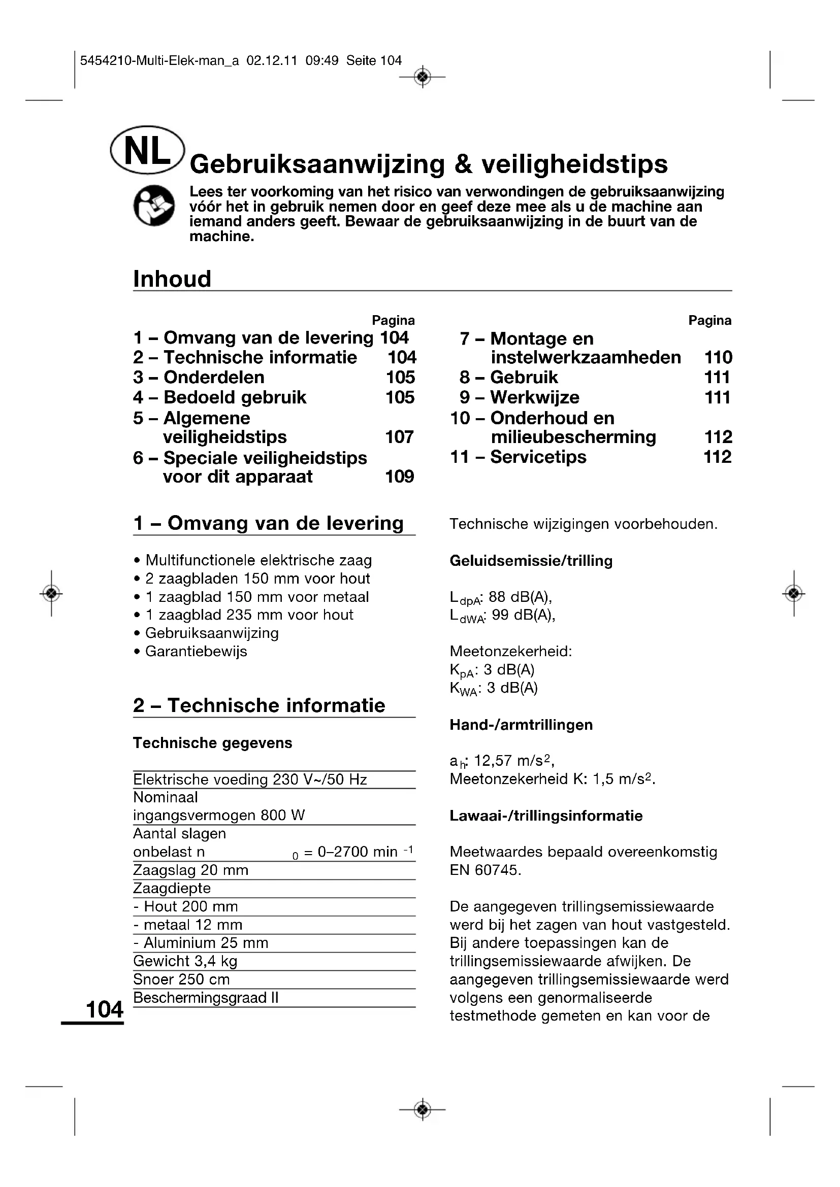 | 5 – Algemeneveiligheidstips | 107 | 10 – Onderhoud enmilieubescherming | 112 |