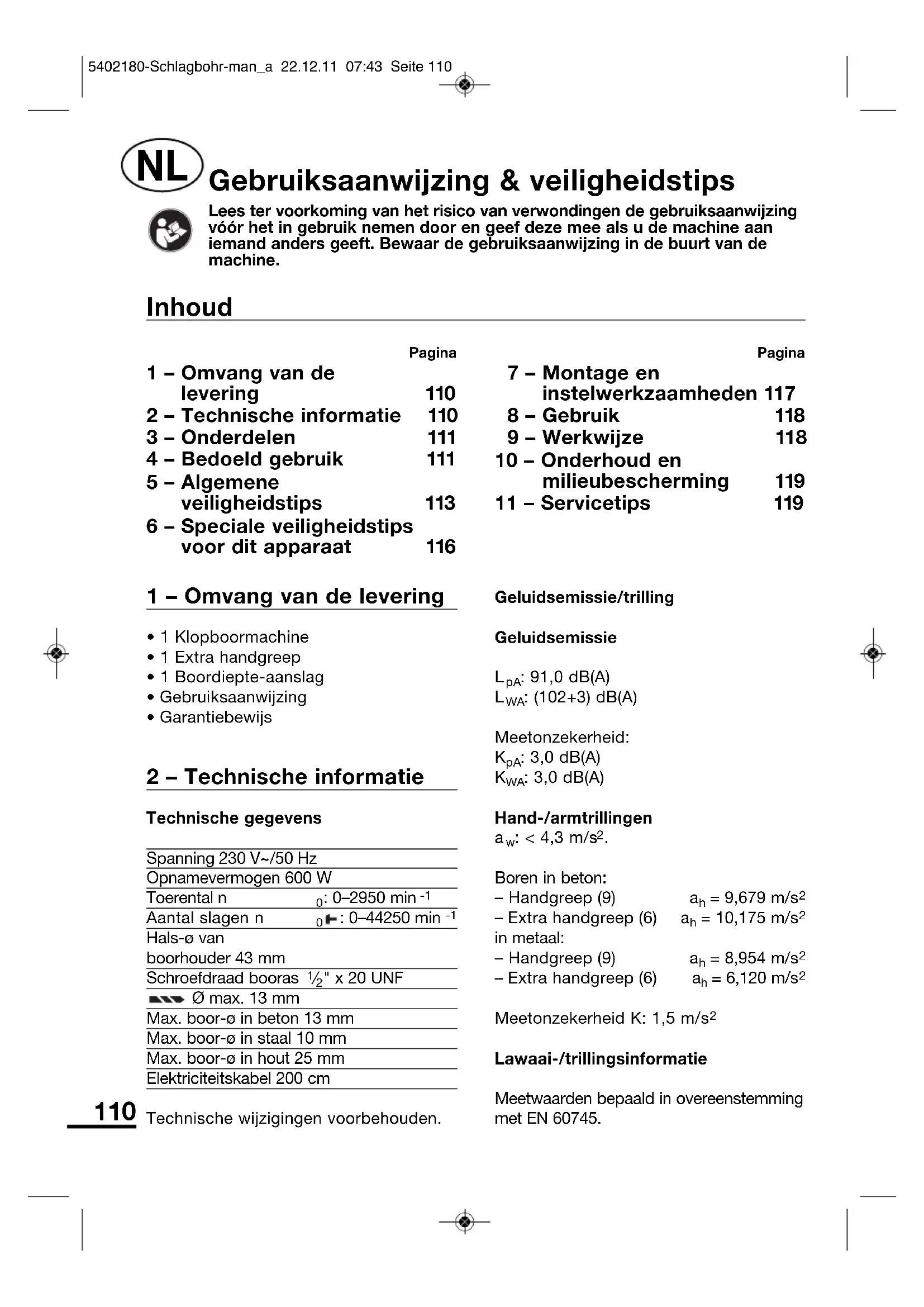| 1 - Omvang van de levering | 110 |