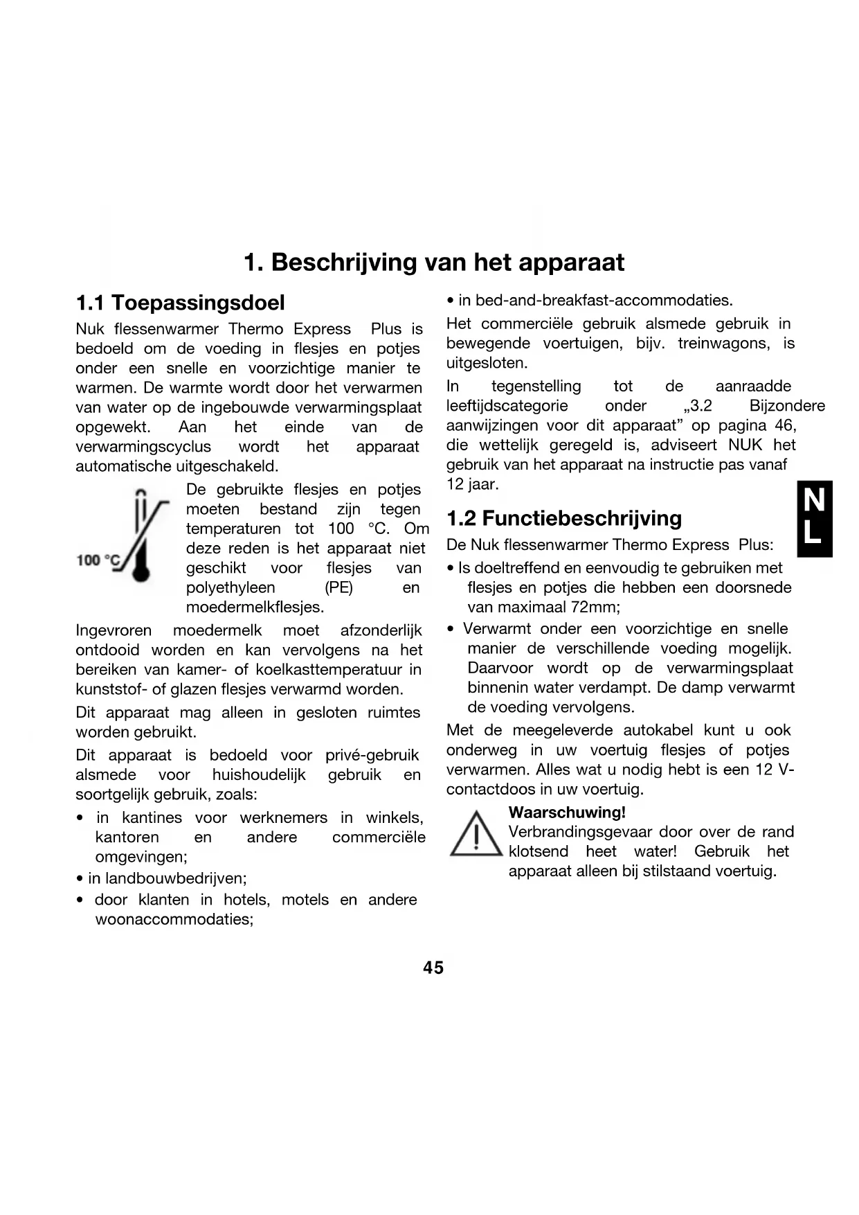 Nuk flessenwarmer Thermo Express Plus is bedoeld om de voeding in flesjes en potjes onder een snelle en voorzichtige manier te warmen. De warmte wordt door het verwarmen van water op de ingebouwde verwarmingsplaat opgewekt. Aan het einde van de verwarmingscyclus wordt het apparaat automatische uitgeschakeld. De gebruikte flesjes en potjes moeten bestand zijn tegen temperaturen tot 100 °C. Om deze reden is het apparaat niet geschikt voor flesjes van polyethyleen (PE) en moedermelkflesjes. Ingevroren moedermelk moet afzonderlijk ontdooid worden en kan vervolgens na het bereiken van kamer- of koelkasttemperatuur in kunststof- of glazen flesjes verwarmd worden. Dit apparaat mag alleen in gesloten ruimtes worden gebruikt. Dit apparaat is bedoeld voor privé-gebruik alsmede voor huishoudelijk gebruik en soortgelijk gebruik, zoals: