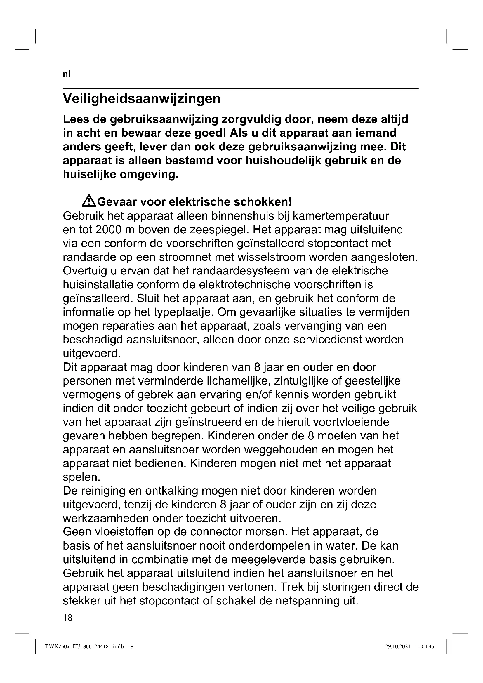 WAARSCHUWING: dit apparaat niet in de buurt van badkuipen, douches, wasbakken of andere recipiënten gebruiken die water bevatten. WVerstikkingsgevaar! Laat kinderen niet met verpakkingsmateriaal spelen. WGevaar voor letsel! Onjuist gebruik van het apparaat kan letsel tot gevolg hebben. WLet op! Reiniging van oppervlakken die met voedingsmiddelen in contact komen! De speciale reinigingsinstructies in de handleiding moeten in acht worden genomen. TWK750x_EU_8001244181.indb 18TWK750x_EU_8001244181.indb 18 29.10.2021 11:04:4529.10.2021 11:04:4519