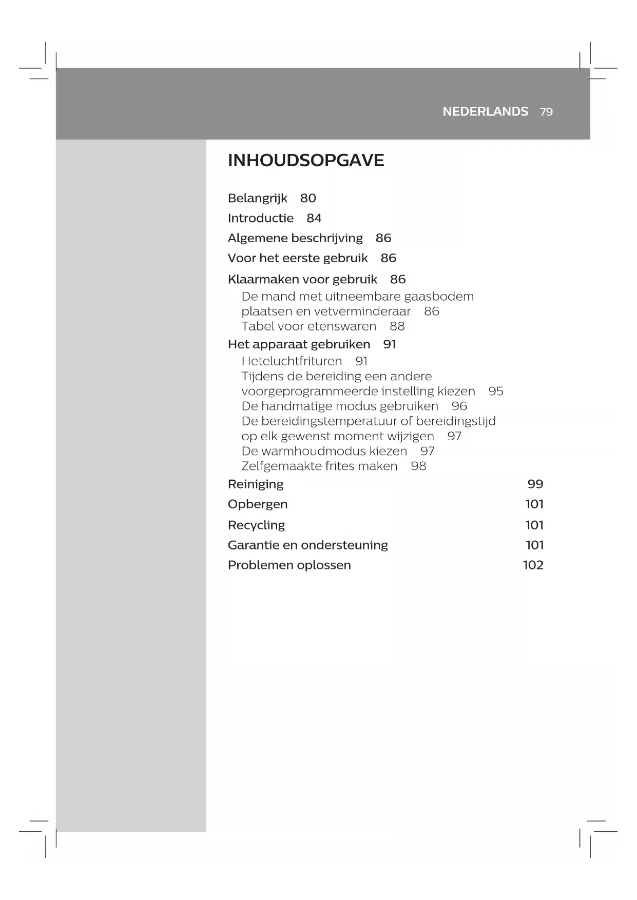 - Assurez-vous toujours que les pièces amovibles de l'Airfryer, par ex. le fond alvéolé amovible, sont xées avant de transporter et/ ou de ranger l'appareil.76 FRANÇAIS Recyclage - Ce symbole signie que ce produit ne doit pas être mis au rebut avec les ordures ménagères (2012/19/UE). - Respectez les règles en vigueur dans votre pays pour la mise au rebut des produits électriques et électroniques. Une mise au rebut correcte contribue à préserver l'environnement et la santé. Garantie et assistance Si vous avez besoin d'une assistance ou d'informations supplémentaires, consultez le site Web www.philips.com/support ou lisez le dépliant séparé sur la garantie internationale. Dépannage Cette rubrique présente les problèmes les plus courants que vous pouvez rencontrer avec votre appareil. Si vous ne parvenez pas à résoudre le problème à l'aide des informations ci-dessous, rendez-vous sur www.philips.com/support pour consulter les questions fréquemment posées ou contactez le Service Consommateurs de votre pays. Problème Cause possible Solution L'extérieur de l'appareil devient chaud en cours d'utilisation. La chaleur interne chaue les parois extérieures. Ce phénomène est normal. Tous les boutons et poignées que vous êtes amené(e) à toucher pendant l'utilisation resteront susamment froids pour que vous puissiez les toucher. La cuve, le panier, le réducteur de graisse et l'intérieur de l'appareil deviennent toujours chauds lorsque l'appareil est sous tension, et ce an de garantir la bonne cuisson des aliments. Ces pièces sont toujours trop chaudes pour que vous puissiez les toucher. Si vous laissez l'appareil allumé pendant longtemps, certaines zones seront très chaudes au toucher. L'icône suivante vous permet de reconnaître ces zones : À partir du moment où vous savez qu'il y a des zones très chaudes et que vous évitez de les toucher, l'appareil ne présente aucun danger.77 FRANÇAIS Problème Cause possible Solution Mes frites maison ne sont pas comme je l'espérais. Vous n'avez pas utilisé la bonne variété de pommes de terre. Pour obtenir les meilleurs résultats, utilisez des pommes de terre fraîches, (légèrement) farineuses. Si vous avez besoin de conserver les pommes de terre, ne les placez pas en milieu froid comme un réfrigérateur. Choisissez des pommes de terre pour lesquelles il est indiqué sur l'emballage qu'elles conviennent à la friture. La quantité d'aliments dans le panier est trop importante. Suivez les instructions de ce mode d'emploi pour préparer des frites maison (voir le tableau de cuisson des aliments ou télécharger l'application gratuite Airfryer). Certains types d'aliments doivent être mélangés à mi-cuisson. Suivez les instructions de ce mode d'emploi pour préparer des frites maison (voir le tableau de cuisson des aliments ou télécharger l'application gratuite Airfryer). L'Airfryer ne s'allume pas. L'appareil n'est pas branché. Lorsque vous allumez l'appareil, vous entendez le ventilateur fonctionner. Si vous n'entendez pas ce son, vériez si la che est correctement branchée sur la prise murale. Plusieurs appareils sont branchés sur une même prise. L’Airfryer est très puissant. Essayez une autre prise et vériez les fusibles. Je vois des éraures dans mon Airfryer. De petites taches peuvent apparaître dans la cuve de l'Airfryer suite à un contact accidentel avec le revêtement (par exemple en nettoyant avec des outils de nettoyage durs et/ou en insérant le panier). Vous pouvez éviter ces éraures en abaissant correctement le panier dans la cuve. Si vous insérez le panier de travers, le côté peut taper contre la paroi de la cuve et abîmer le revêtement. Si cela se produit, sachez que ce n'est pas nocif car tous les matériaux utilisés sont sûrs pour les aliments. De la fumée blanche s'échappe de l'appareil. Vous cuisinez des aliments gras alors que le réducteur de graisse n'est pas installé dans la cuve. Videz soigneusement l'excédent d'huile ou de graisse de la cuve, installez le réducteur de graisse dans la cuve, puis poursuivez la cuisson. La cuve contient des résidus de graisse de l'utilisation précédente. La fumée blanche est causée par la cuisson de résidus de graisse dans la cuve. Nettoyez soigneusement la cuve, le panier et le réducteur de graisse après chaque utilisation.78 FRANÇAIS Problème Cause possible Solution La chapelure n'adhère pas correctement aux aliments. De petits morceaux de chapelure peuvent provoquer un dégagement de fumée blanche. Appuyez bien la chapelure sur aliments an qu'elle adhère. Il y a des éclaboussures de marinade, de liquide ou de jus de viande dans la graisse fondue ou l'huile. Épongez les aliments avant de les placer dans le panier. L'acheur indique 5 tirets comme illustré dans l'image ci-dessous. La fonction de sécurité a été activée en raison de la surchaue de l'appareil. Débranchez l'appareil et laissez-le refroidir pendant 1 minute avant de le rebrancher.79 NEDERLANDS INHOUDSOPGAVE Belangrijk 80 Introductie 84 Algemene beschrijving 86 Voor het eerste gebruik 86 Klaarmaken voor gebruik 86 De mand met uitneembare gaasbodem plaatsen en vetverminderaar 86 Tabel voor etenswaren 88 Het apparaat gebruiken 91 Heteluchtfrituren 91 Tijdens de bereiding een andere voorgeprogrammeerde instelling kiezen 95 De handmatige modus gebruiken 96 De bereidingstemperatuur of bereidingstijd op elk gewenst moment wijzigen 97 De warmhoudmodus kiezen 97 Zelfgemaakte frites maken 98 Reiniging 99 Opbergen 101 Recycling 101 Garantie en ondersteuning 101 Problemen oplossen 10280 NEDERLANDS Belangrijk Lees deze belangrijke informatie zorgvuldig door voordat u het apparaat gaat gebruiken. Bewaar het boekje om het indien nodig later te kunnen raadplegen. Gevaar - Doe de etenswaren die u wilt bakken altijd in de mand om te voorkomen dat ze met de verwarmingselementen in contact komen. - Bedek de luchtinlaat- en -uitlaatopeningen niet wanneer het apparaa