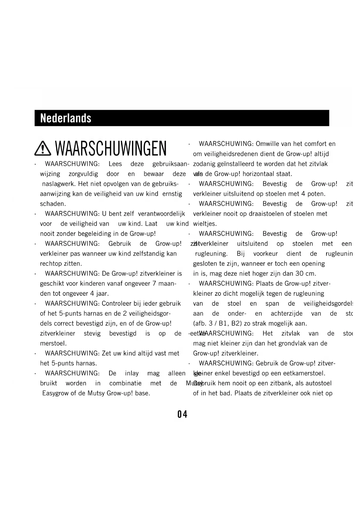 - WAARSCHUWING: Controleer bij ieder gebruik of het 5-punts harnas en de 2 veiligheidsgordels correct bevestigd zijn, en of de Grow-up! zitverkleiner stevig bevestigd is op de merstoel.