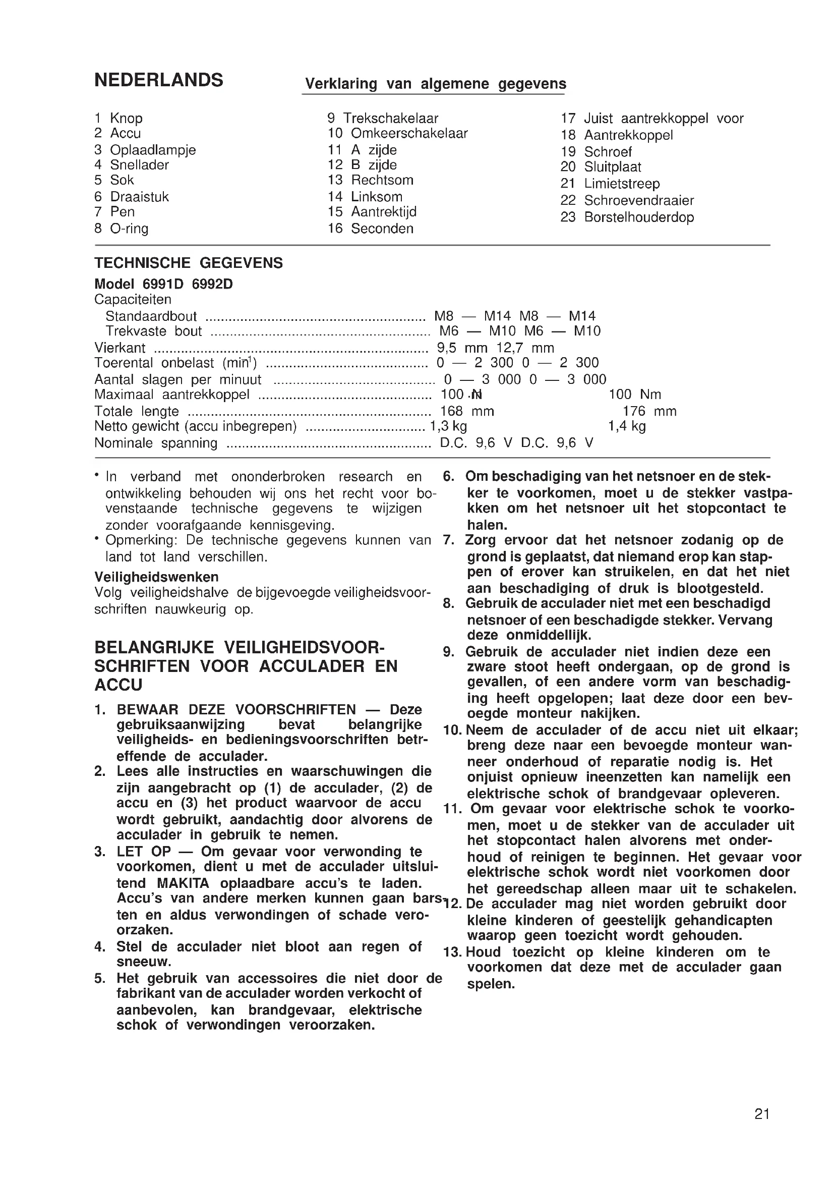 6991D/6992D (It) (’100. 6. 12)NEDERLANDS Verklaring van algemene gegevens 1 Knop 2 Accu 3 Oplaadlampje 4 Snellader 5 Sok 6 Draaistuk 7 Pen 8 O-ring 9 Trekschakelaar 10 Omkeerschakelaar 11 A zijde 12 B zijde 13 Rechtsom 14 Linksom 15 Aantrektijd 16 Seconden 17 Juist aantrekkoppel voor 18 Aantrekkoppel 19 Schroef 20 Sluitplaat 21 Limietstreep 22 Schroevendraaier 23 Borstelhouderdop TECHNISCHE GEGEVENS Model 6991D 6992D Capaciteiten Standaardbout ......................................................... M8 — M14 M8 — M14 Trekvaste bout ......................................................... M6 — M10 M6 — M10 Vierkant ....................................................................... 9,5 mm 12,7 mm Toerental onbelast (min