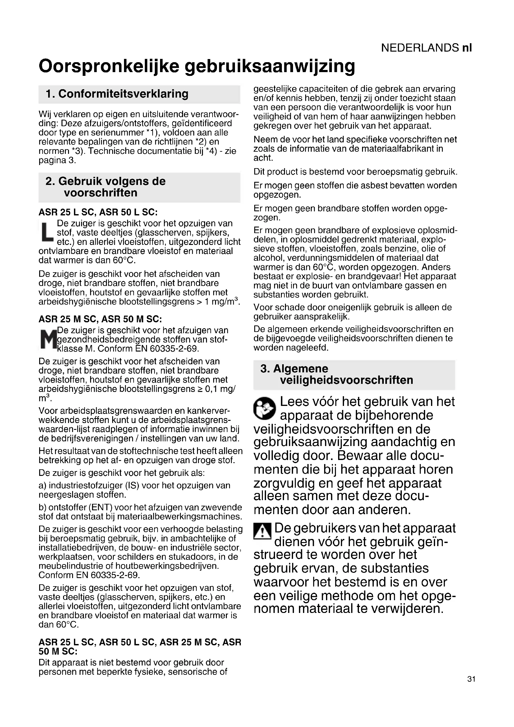 Oorspronkelijke gebruiksaanwijzing Wij verklaren op eigen en uitsluitende verantwoor- ding: Deze afzuigers/ontstoffers, geïdentificeerd door type en serienummer *1), voldoen aan alle relevante bepalingen van de richtlijnen *2) en normen *3). Technische documentatie bij *4) - zie pagina 3. ASR 25 L SC, ASR 50 L SC: De zuiger is geschikt voor het opzuigen van stof, vaste deeltjes (glasscherven, spijkers, etc.) en allerlei vloeistoffen, uitgezonderd licht ontvlambare en brandbare vloeistof en materiaal dat warmer is dan 60°C. De zuiger is geschikt voor het afscheiden van droge, niet brandbare stoffen, niet brandbare vloeistoffen, houtstof en gevaarlijke stoffen met arbeidshygiënische blootstellingsgrens > 1 mg/m³. ASR 25 M SC, ASR 50 M SC: De zuiger is geschikt voor het afzuigen van gezondheidsbedreigende stoffen van stof- klasse M. Conform EN 60335-2-69. De zuiger is geschikt voor het afscheiden van droge, niet brandbare stoffen, niet brandbare vloeistoffen, houtstof en gevaarlijke stoffen met arbeidshygiënische blootstellingsgrens ≥ 0,1 mg/ m³. Voor arbeidsplaatsgrenswaarden en kankerver- wekkende stoffen kunt u de arbeidsplaatsgrens- waarden-lijst raadplegen of informatie inwinnen bij de bedrijfsverenigingen / instellingen van uw land. Het resultaat van de stoftechnische test heeft alleen betrekking op het af- en opzuigen van droge stof. De zuiger is geschikt voor het gebruik als: a) industriestofzuiger (IS) voor het opzuigen van neergeslagen stoffen. b) ontstoffer (ENT) voor het afzuigen van zwevende stof dat ontstaat bij materiaalbewerkingsmachines. De zuiger is geschikt voor een verhoogde belasting bij beroepsmatig gebruik, bijv. in ambachtelijke of installatiebedrijven, de bouw- en industriële sector, werkplaatsen, voor schilders en stukadoors, in de meubelindustrie of houtbewerkingsbedrijven. Conform EN 60335-2-69. De zuiger is geschikt voor het opzuigen van stof, vaste deeltjes (glasscherven, spijkers, etc.) en allerlei vloeistoffen, uitgezonderd licht ontvlambare en brandbare vloeistof en materiaal dat warmer is dan 60°C. ASR 25 L SC, ASR 50 L SC, ASR 25 M SC, ASR 50 M SC: Dit apparaat is niet bestemd voor gebruik door personen met beperkte fysieke, sensorische of geestelijke capaciteiten of die gebrek aan ervaring en/of kennis hebben, tenzij zij onder toezicht staan van een persoon die verantwoordelijk is voor hun veiligheid of van hem of haar aanwijzingen hebben gekregen over het gebruik van het apparaat. Neem de voor het land specifieke voorschriften net zoals de informatie van de materiaalfabrikant in acht. Dit product is bestemd voor beroepsmatig gebruik. Er mogen geen stoffen die asbest bevatten worden opgezogen. Er mogen geen brandbare stoffen worden opge- zogen. Er mogen geen brandbare of explosieve oplosmid- delen, in oplosmiddel gedrenkt materiaal, explo- sieve stoffen, vloeistoffen, zoals benzine, olie of alcohol, verdunningsmiddelen of materiaal dat warmer is dan 60°C, worden opgezogen. Anders bestaat er explosie- en brandgevaar! Het apparaat mag niet in de buurt van ontvlambare gassen en substanties worden gebruikt. Voor schade door oneigenlijk gebruik is alleen de gebruiker aansprakelijk. De algemeen erkende veiligheidsvoorschriften en de bijgevoegde veiligheidsvoorschriften dienen te worden nageleefd. Lees vóór het gebruik van het apparaat de bijbehorende veiligheidsvoorschriften en de gebruiksaanwijzing aandachtig en volledig door. Bewaar alle docu- menten die bij het apparaat horen zorgvuldig en geef het apparaat alleen samen met deze docu- menten door aan anderen. De gebruikers van het apparaat dienen vóór het gebruik geïn- strueerd te worden over het gebruik ervan, de substanties waarvoor het bestemd is en over een veilige methode om het opge- nomen materiaal te verwijderen.