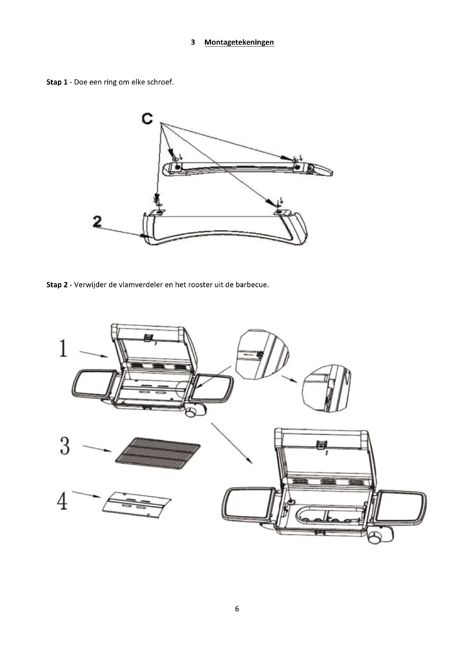 - Gebruik geen draaispit bij regen.5 2 Onderdelen Vleugelmoer 4x Ring M6 4x Ring M6.5 8x Barbecue Poten Rooster Vlamverdeler Vetopvangbak6 3 Montagetekeningen Stap 1 - Doe een ring om elke schroef. Stap 2 - Verwijder de vlamverdeler en het rooster uit de barbecue.7