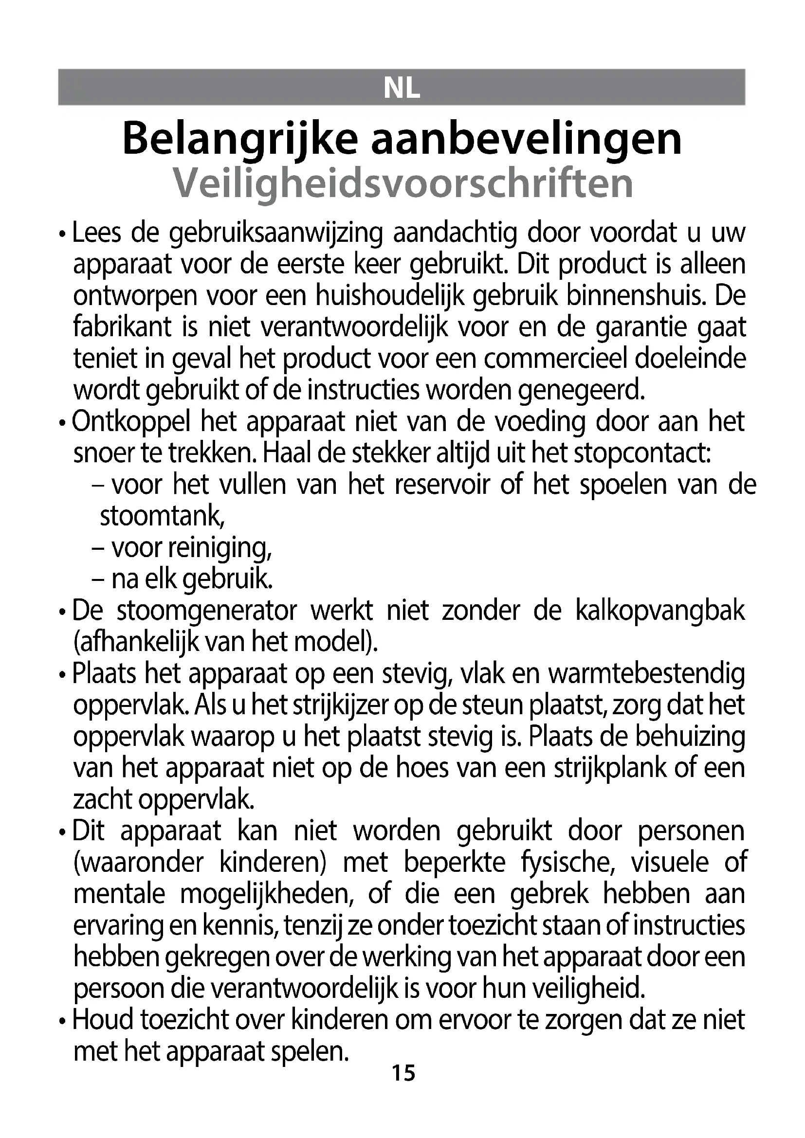 - Uw stoomgenerator is een elektrisch apparaat en moet in normale omstandigheden worden gebruikt.
