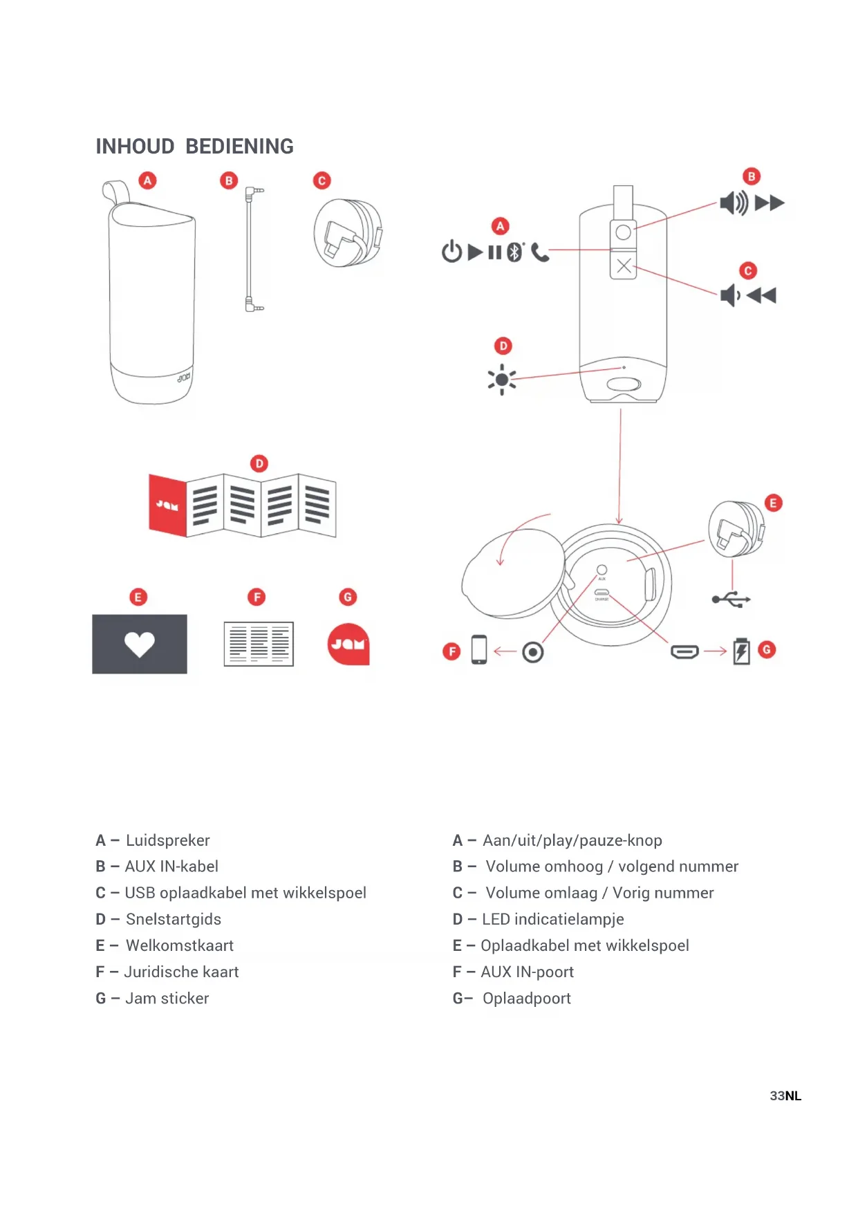 ”Zero Chill“ HX-P606 Gebruiksaanwijzing33NL INHOUD BEDIENING A – Luidspreker B – AUX IN-kabel C – USB oplaadkabel met wikkelspoel D – Snelstartgids E – Welkomstkaart F – Juridische kaart G – Jam sticker A – Aan/uit/play/pauze-knop B – Volume omhoog / volgend nummer C – Volume omlaag / Vorig nummer D – LED indicatielampje E – Oplaadkabel met wikkelspoel F – AUX IN-poort G– Oplaadpoort34 CHARGE AUX CHARGE INSTELLEN 2hrs 12hrs 3 hrs 22 hrs