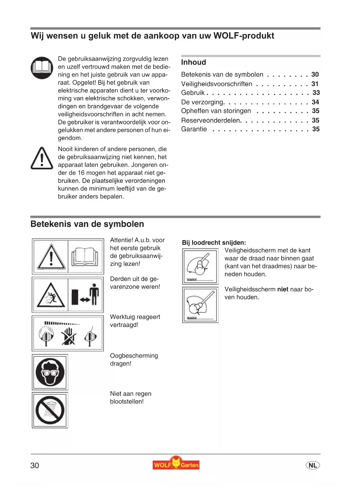 De draadmaaier mag niet met stromend water en vooral niet onder hoge druk gereinigd worden. z Reparaties mogen alleen door de WOLF offi ciele werkplaatsen worden uitgevoerd. z Let erop, dat luchtopeningen niet zijn verstopt. z Berg de machine niet op binnen handbereik van kinderen.32