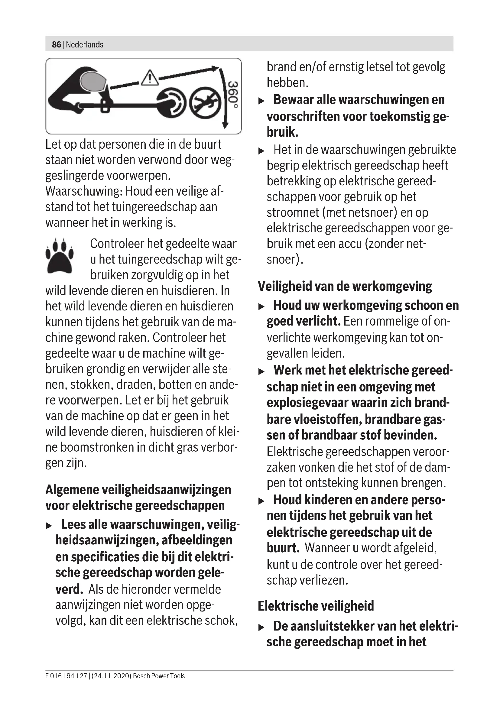 a.c. Niet van toepas- sing. d.c. Verwijder de accu uit het tuin- gereedschap voordat u instel- of reinigingswerkzaamheden aan het tuingereedschap uitvoert of wanneer dit enige tijd onbeheerd blijft. Draag een gehoorbescher- ming en een veiligheidsbril. Gebruik het product niet in de regen en laat het niet in de re- gen liggen of staan. Bosch Power Tools F 016 L94 127 | (24.11.2020)86 | Nederlands Let op dat personen die in de buurt staan niet worden verwond door weg- geslingerde voorwerpen. Waarschuwing: Houd een veilige af- stand tot het tuingereedschap aan wanneer het in werking is. Controleer het gedeelte waar u het tuingereedschap wilt ge- bruiken zorgvuldig op in het wild levende dieren en huisdieren. In het wild levende dieren en huisdieren kunnen tijdens het gebruik van de ma- chine gewond raken. Controleer het gedeelte waar u de machine wilt ge- bruiken grondig en verwijder alle ste- nen, stokken, draden, botten en ande- re voorwerpen. Let er bij het gebruik van de machine op dat er geen in het wild levende dieren, huisdieren of klei- ne boomstronken in dicht gras verbor- gen zijn. Algemene veiligheidsaanwijzingen voor elektrische gereedschappen u Lees alle waarschuwingen, veilig- heidsaanwijzingen, afbeeldingen en specificaties die bij dit elektri- sche gereedschap worden gele- verd. Als de hieronder vermelde aanwijzingen niet worden opge- volgd, kan dit een elektrische schok, brand en/of ernstig letsel tot gevolg hebben. u Bewaar alle waarschuwingen en voorschriften voor toekomstig ge- bruik. u Het in de waarschuwingen gebruikte begrip elektrisch gereedschap heeft betrekking op elektrische gereed- schappen voor gebruik op het stroomnet (met netsnoer) en op elektrische gereedschappen voor ge- bruik met een accu (zonder net- snoer). Veiligheid van de werkomgeving u Houd uw werkomgeving schoon en goed verlicht. Een rommelige of on- verlichte werkomgeving kan tot on- gevallen leiden. u Werk met het elektrische gereed- schap niet in een omgeving met explosiegevaar waarin zich brand- bare vloeistoffen, brandbare gas- sen of brandbaar stof bevinden. Elektrische gereedschappen veroor- zaken vonken die het stof of de dam- pen tot ontsteking kunnen brengen. u Houd kinderen en andere perso- nen tijdens het gebruik van het elektrische gereedschap uit de buurt. Wanneer u wordt afgeleid, kunt u de controle over het gereed- schap verliezen. Elektrische veiligheid u De aansluitstekker van het elektri- sche gereedschap moet in het F 016 L94 127 | (24.11.2020) Bosch Power ToolsNederlands | 87 stopcontact passen. De stekker mag in geen geval worden veran- derd. Gebruik geen adapterstek- kers in combinatie met geaarde elektrische gereedschappen. On- veranderde stekkers en passende stopcontacten beperken het risico van een elektrische schok. u Voorkom aanraking van het li- chaam met geaarde oppervlakken, bijvoorbeeld van buizen, verwar- mingen, fornuizen en koelkasten. Er bestaat een verhoogd risico door een elektrische schok wanneer uw li- chaam geaard is. u Houd het gereedschap uit de buurt van regen en vocht. Het binnen- dringen van water in het elektrische gereedschap vergroot het risico van een elektrische schok. u Gebruik de kabel niet voor een verkeerd doel, om het elektrische gereedschap te dragen of op te hangen of om de stekker uit het stopcontact te trekken. Houd de kabel uit de buurt van hitte, olie, scherpe randen of bewegende de- len. Beschadigde of in de war ge- raakte kabels vergroten het risico van een elektrische schok. u Wanneer u buitenshuis met elek- trisch gereedschap werkt, dient u alleen verlengkabels te gebruiken die voor gebruik buitenshuis zijn goedgekeurd. Het gebruik van een voor gebruik buitenshuis geschikte verlengkabel beperkt het risico van een elektrische schok. u Als het gebruik van het elektrische gereedschap in een vochtige om- geving onvermijdelijk is, dient u een aardlekschakelaar te gebrui- ken. Het gebruik van een aardlek- schakelaar vermindert het risico van een elektrische schok. Veiligheid van personen u Wees alert, let goed op wat u doet en ga met verstand te werk bij het gebruik van het elektrische ge- reedschap. Gebruik geen elek- trisch gereedschap, wanneer u moe bent of onder invloed staat van drugs, alcohol of medicijnen. Een moment van onoplettendheid bij het gebruik van het elektrische ge- reedschap kan tot ernstige verwon- dingen leiden. u Draag persoonlijke beschermings- middelen. Draag altijd een veilig- heidsbril. Het dragen van persoon- lijke beschermingsmiddelen zoals een stofmasker, slipvaste werk- schoenen, een veiligheidshelm of ge- hoorbescherming, afhankelijk van de aard en het gebruik van het elektri- sche gereedschap, vermindert het ri- sico van verwondingen. u Voorkom per ongeluk inschake- len. Controleer dat het elektrische gereedschap uitgeschakeld is, voordat u de stekker in het stop- contact steekt of de accu aansluit Bosch Power Tools F 016 L94 127 | (24.11.2020)88 | Nederlands en voordat u het gereedschap op- pakt of draagt. Wanneer u bij het dragen van het elektrische gereed- schap uw vinger aan de schakelaar hebt of wanneer u het gereedschap ingeschakeld op de stroomvoorzie- ning aansluit, kan dit tot ongevallen leiden. u Verwijder instelgereedschappen of schroefsleutels, voordat u het elektrische gereedschap inscha- kelt. Een instelgereedschap of sleu- tel in een draaiend deel van het ge- reedschap kan tot verwondingen lei- den. u Voorkom een onevenwichtige li- chaamshouding. Zorg ervoor dat u stevig staat en steeds in even- wicht blijft. Daardoor kunt u het elektrische gereedschap in onver- wachte situaties beter onder contro- le houden. u Draag geschikte kleding. Draag geen loshangende kleding of siera- den. Houd haren en kleding uit de buurt van bewegende delen. Los- hangende kleding, lange haren en sieraden kunnen door bewegende delen worden meegenomen. u Wanneer stofafzuigings- of stofop- vangvoorzieningen kunnen wor- den gemonteerd, dient u zich er- van te verzekeren dat deze zijn aangesloten en juist worden ge- bruikt