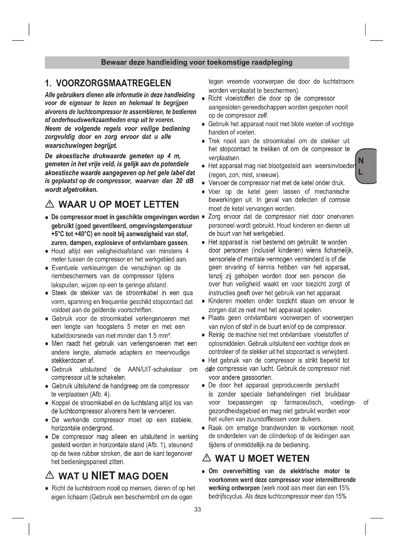 Alle gebruikers dienen alle informatie in deze handleiding voor de eigenaar te lezen en helemaal te begrijpen alvorens de luchtcompressor te assembleren, te bedienen of onderhoudswerkzaamheden erop uit te voeren. Neem de volgende regels voor veilige bediening zorgvuldig door en zorg ervoor dat u alle waarschuwingen begrijpt. De akoestische drukwaarde gemeten op 4 m, gemeten in het vrije veld, is gelijk aan de potentiele akoestische waarde aangegeven op het gele label dat is geplaatst op de compressor, waarvan dan 20 dB wordt afgetrokken.