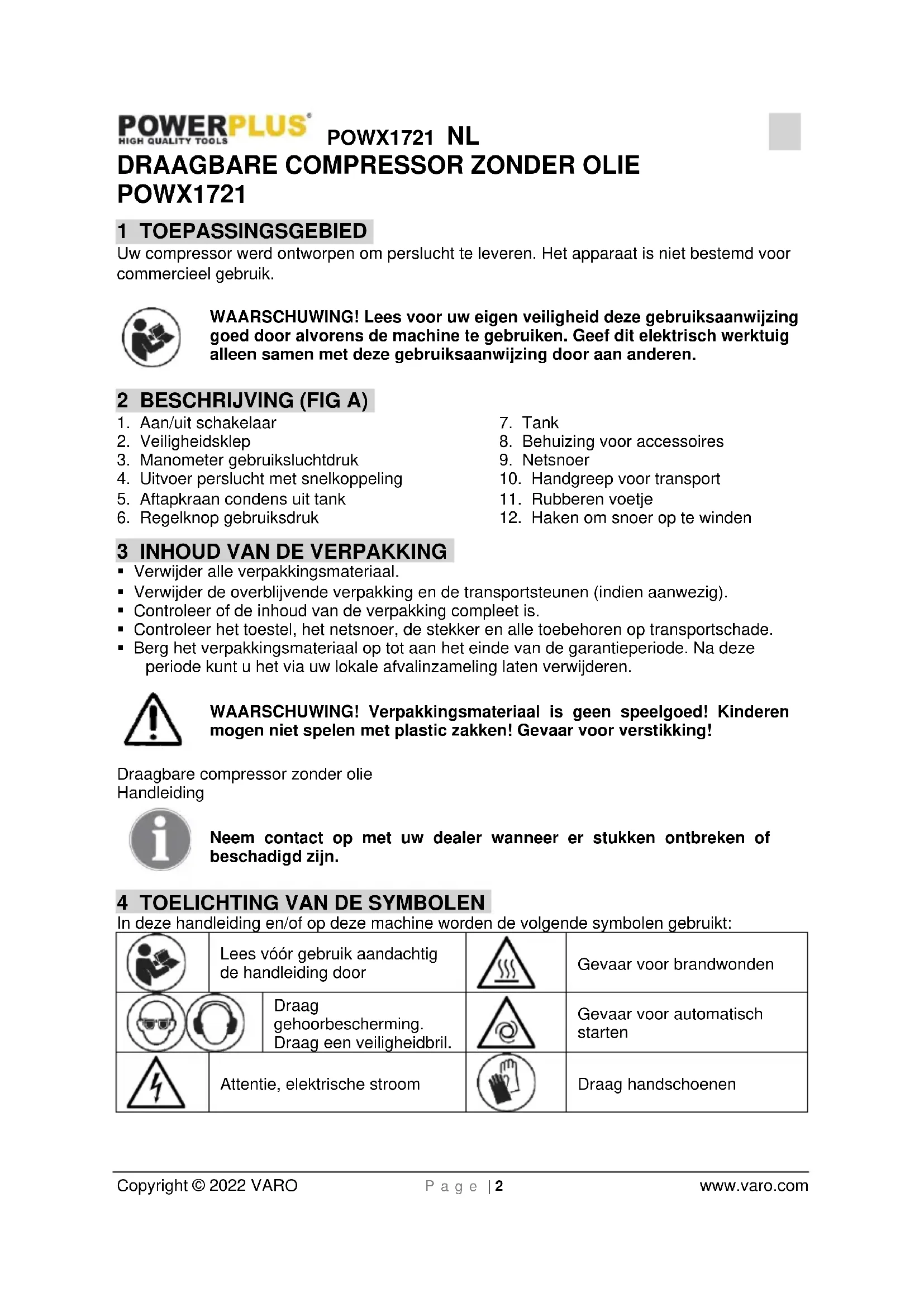 - Laat uw apparaat uitsluitend door gekwalificeerde vaklui en met originele reserveonderdelen herstellen. Zo bent u zeker dat de veiligheid van het apparaat behouden blijft.POWX1721 NL Copyright © 2022 VARO P a g e | 5 www.varo.com 6 BIJZONDERE VEILIGHEIDSVOORSCHRIFTEN Dit symbool geeft de waarschuwingen aan die aandachtig gelezen moeten worden alvorens het product te gebruiken, teneinde mogelijk letsel van de gebruiker te voorkomen. Perslucht is een potentieel gevaarlijke vorm van energie. Het is dan ook nodig om extreme voorzichtigheid te betrachten bij het gebruik van de compressor en de accessoires. Attentie: de compressor kan in geval van black-out en daaropvolgend herstel van de spanning weer van start gaan. De akkoestische drukwaarde gemeten 4 m. is gelijk met de potentiele akkoestische waarde aangetoond op het gele label dat is geplaatst op de compressor, min 20 dB.