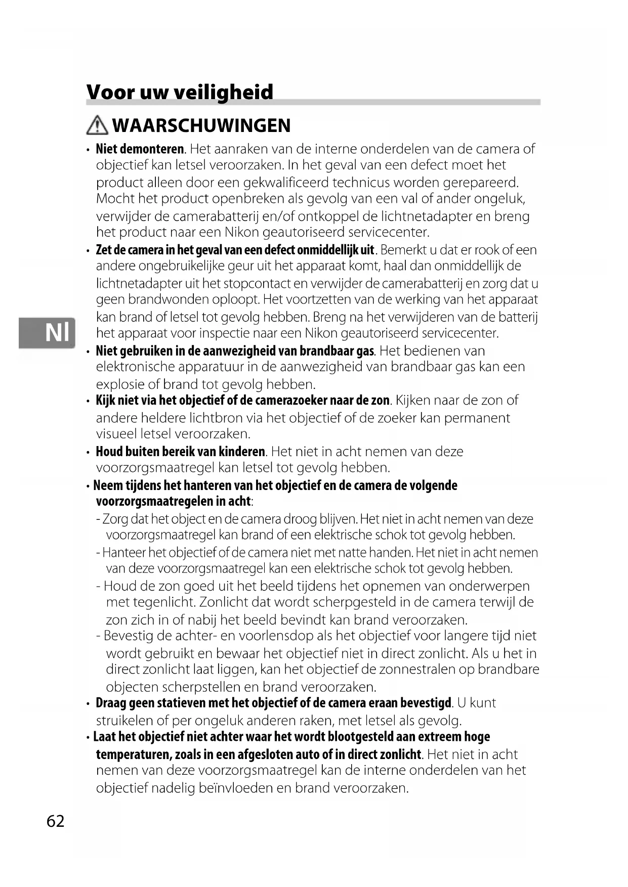 Zet de camera in het geval van een defect onmiddellijk uit . Bemerkt u dat er rook of een andere ongebruikelijke geur uit het apparaat komt, haal dan onmiddellijk de lichtnetadapter uit het stopcontact en verwijder de camerabatterij en zorg dat u geen brandwonden oploopt. Het voortzetten van de werking van het apparaat kan brand of letsel tot gevolg hebben. Breng na het verwijderen van de batterij het apparaat voor inspectie naar een Nikon geautoriseerd servicecenter.